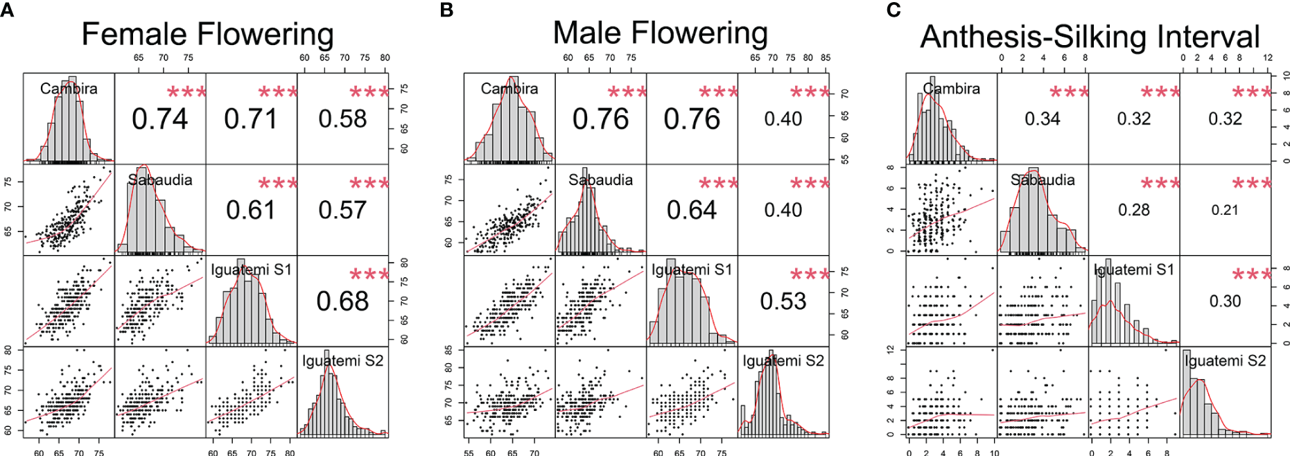 Correlation among the study environments (Cambira, Sabaudia, Iguatemi season 1 and Iguatemi season 2) for each flowering trait: female and male flowering (A, B, respectively); and anthesis-silking interval (C). The diagonal line of the plot illustrates the histograms and the distribution of the observed phenotype values for each trait across all environments. The lower off-diagonal section presents the scatterplot between the environments for each trait, whereas the upper off-diagonal section displays the correlation coefficient between environments for each trait. Significance levels of the correlation coefficients is indicated by *** for p< 0.001.