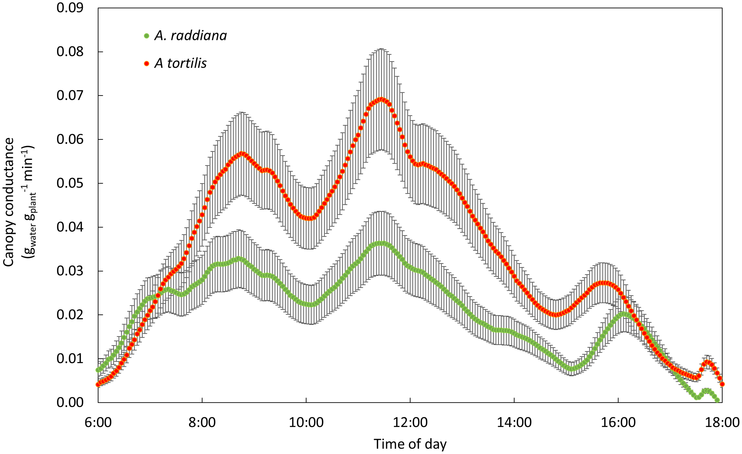 Recovery of A. tortilis (orange) and A. raddiana (green) in the first 24hr post 14 days of drought. Diurnal pattern of canopy conductance (n=5-7 average, SE error bars).