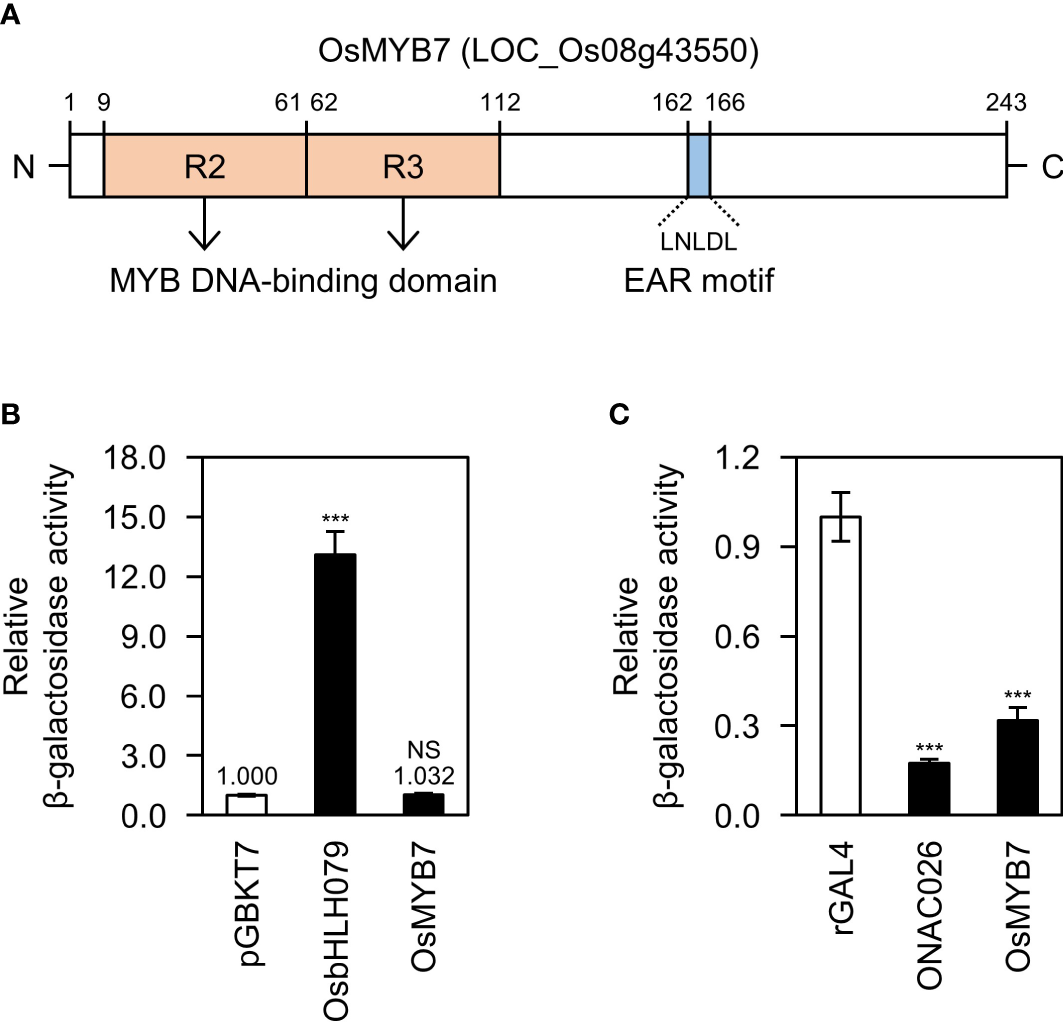 Biochemical characterization of OsMYB7. (A) Schematic diagram of the OsMYB7 protein. The two pale orange boxes indicate the highly conserved R2 and R3 MYB repeats. OsMYB7 also harbors an LxLxL-type EAR transcriptional repression motif, shown by the blue box. EAR, ethylene-responsive element binding factor-associated amphiphilic repression. (B) Transactivation activity assay of OsMYB7 in yeast. The full-length coding sequence of OsMYB7 cloned in the vector pGBKT7 was subjected to a quantitative β-galactosidase liquid assay: OsbHLH079 was used as a positive control, and pGBKT7 was used as a negative control. The β-galactosidase activity of each sample was normalized relative to that of the negative control, which was set to 1. Data are presented as means ± standard deviation (SD) from four independent yeast colonies. Significant differences between means were determined using two-tailed Student’s t-test (***P < 0.001). This experiment was performed twice with similar results. NS, not significant. (C) Trans-repression activity assay of OsMYB7 in yeast. The full-length coding sequence of OsMYB7 cloned in the vector rGAL4 was subjected to a quantitative β-galactosidase liquid assay: ONAC026 was used as a positive control, and rGAL4 was used as a negative control. The β-galactosidase activity of each sample was normalized to that of the negative control, which was set to 1. Data are presented as means ± SD of four independent yeast colonies. Asterisks indicate significant differences as determined by two-tailed Student’s t-test (***P < 0.001). This experiment was conducted twice yielding similar results. NS, not significant.