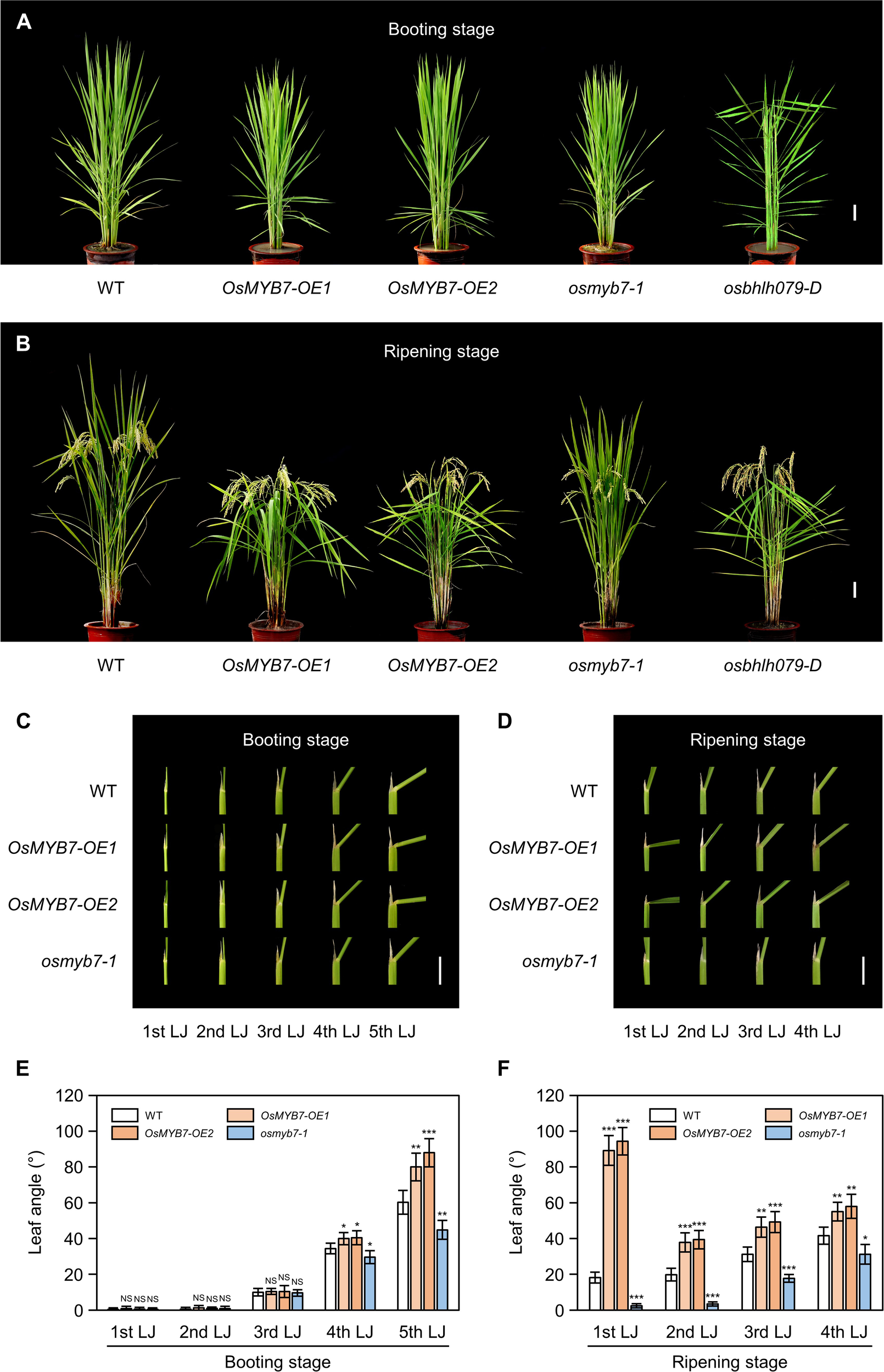 OsMYB7 determines leaf angle at the late stage of lamina joint development. (A, B) Phenotypes of WT, OsMYB7-OE1, OsMYB7-OE2, osmyb7-1, and osbhlh079-D plants at the booting stage (105 DAS) (A) and at the ripening stage (30 DAH) (B) grown under natural long day conditions in a paddy field. The osbhlh079-D plant represents a typical mutant with increased leaf angles due to enhanced BR signaling. Scale: 10 cm. (C, D) Lamina joints of WT, OsMYB7-OE1, OsMYB7-OE2, and osmyb7-1 plants. Samples in (C, D) were obtained from the plants shown in (A,B), respectively. Scale: 1 cm. (E, F) Leaf angle in WT, OsMYB7-OE1, OsMYB7-OE2, and osmyb7-1 plants at the booting stage (105 DAS) (E) and at the ripening stage (30 DAH) (F) grown in a paddy field. Data are presented as means ± SD from five independent plants (5 leaf angles per plant). Asterisks indicate significant differences compared to WT as determined by two-tailed Student’s t-test (*P < 0.05, **P < 0.01, and ***P < 0.001). DAH, days after heading; DAS, days after sowing; NS, not significant; nth LJ, lamina joint of nth leaf.