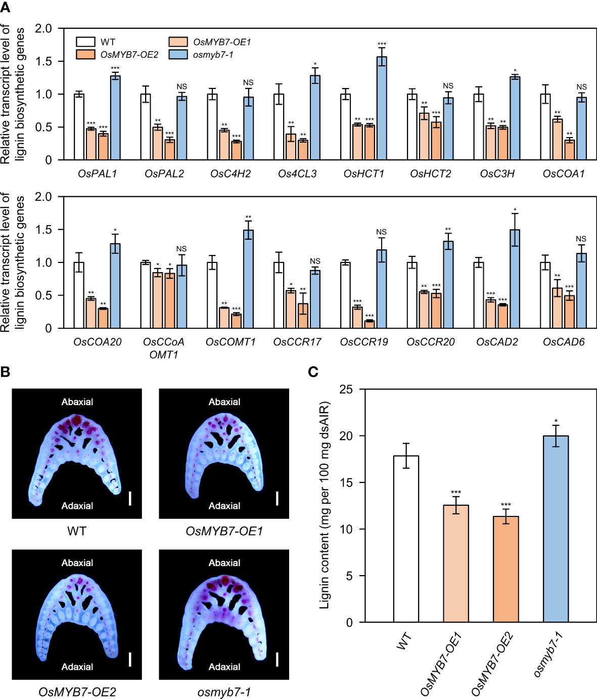 Lignin modulates leaf angle by determining the mechanical strength of lamina joints (Sun et al., 2020; Wang R. et al., 2020). Thus, we speculated that OsMYB7 might dictate leaf angle by controlling lignin biosynthesis. To test whether OsMYB7 function is closely associated with lignin, we examined the transcript levels of 16 lignin biosynthetic genes (see Supplementary Table S3). We determined that transcript abundances of these lignin biosynthetic genes were significantly altered in OsMYB7 overexpressors and the osmyb7-1 mutant in opposite directions: they were downregulated in OsMYB7 overexpressors and upregulated in the osmyb7-1 mutant (Figure 4A).