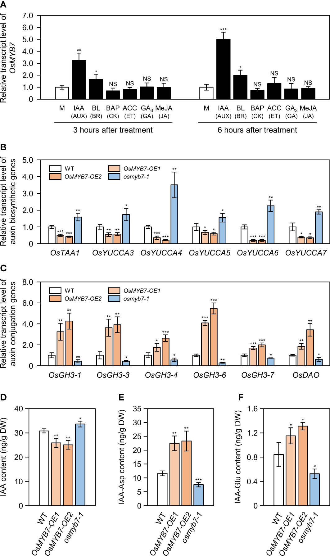 Alteration in free auxin levels at lamina joints may be one cause of different leaf angle phenotypes among WT, OsMYB7-OE1, OsMYB7-OE2, and osmyb7-1. (A) Relative OsMYB7 expression levels in response to various phytohormones determining leaf angle. WT seedlings were grown on half-strength solid MS medium for ten days under constant light conditions at 28°C, followed by incubation in half-strength liquid MS medium containing with 100 μM IAA, 10 μM BL, 10 μM BAP, 10 mM ACC, 100 μM GA3, or 100 μM MeJA. WT seedlings incubated in half-strength liquid MS medium without phytohormone were used as a mock. Total RNA was extracted from shoots collected after 3 or 6 h of treatment, and used for RT-qPCR analysis. The transcript levels of OsMYB7 were normalized to those of GAPDH, with the expression level in the phytohormone-treated group shown relative to that in the mock-treated group, which was set to 1. Data are presented as means ± SD from four biological samples (around 3 shoots per sample). Asterisks indicate significant differences compared to the mock-treated sample, as determined by two-tailed Student’s t-test (*P < 0.05, **P < 0.01, and ***P < 0.001). This experiment was performed independently twice and similar results were obtained. AUX, auxin; BR, brassinosteroid; CK, cytokinin; ET, ethylene; GA, gibberellin; JA, jasmonic acid; M, mock; NS, not significant. (B, C) Relative expression of auxin biosynthetic (B) and conjugation (C) genes at the lamina joint. The cDNA samples in Figure 4A were subjected to RT-qPCR analysis. GAPDH was used as an internal control and the relative expression of each gene is shown relative to that in WT (set to 1). Data are presented as means ± SD of four biological replicates. Asterisks indicate significant differences as determined by two-tailed Student’s t-test (*P < 0.05, **P < 0.01, and ***P < 0.001). These experiments were conducted twice yielding similar results. (D–F) Contents for free IAA and IAA-amino acid conjugates (IAA-Asp and IAA-Glu). Flag leaf lamina joints at the S5 developmental stage in WT, OsMYB7-OE1, OsMYB7-OE2, and osmyb7-1 plants were collected and subjected to LC-ESI-MS/MS analysis for quantification of free IAA (D), IAA-Asp (E), and IAA-Glu (F). Data are presented as means ± SD from four biological replicates (around 10 lamina joints per plant and around 15 plants per replicates). Asterisks indicate significant differences as determined by two-tailed Student’s t-test (*P < 0.05, **P < 0.01, and ***P < 0.001). DW, dry weight; IAA, indole-3-acetic acid; IAA-Asp, IAA-aspartate; IAA-Glu, IAA-glutamate.