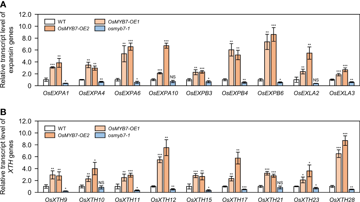 Expression analysis of cell elongation-related genes at the lamina joint. (A, B) Relative transcript levels of expansin (A) and XTH(B) genes in WT, OsMYB7-OE1, OsMYB7-OE2, and osmyb7-1 plants. Total RNA samples obtained in Figure 4A were used for RT-qPCR analysis. The expression level of each examined gene was normalized to that of GAPDH, and shown relative to WT levels, which were set to 1. Data are presented as means ± SD (n = 4); asterisks indicate significant differences as determined by two-tailed Student’s t-test (*P < 0.05, **P < 0.01, and ***P < 0.001). These experiments were carried out twice with independent biological replicates, and similar results were obtained. NS, not significant; XTH, xyloglucan endotransglucosylase/hydrolase.