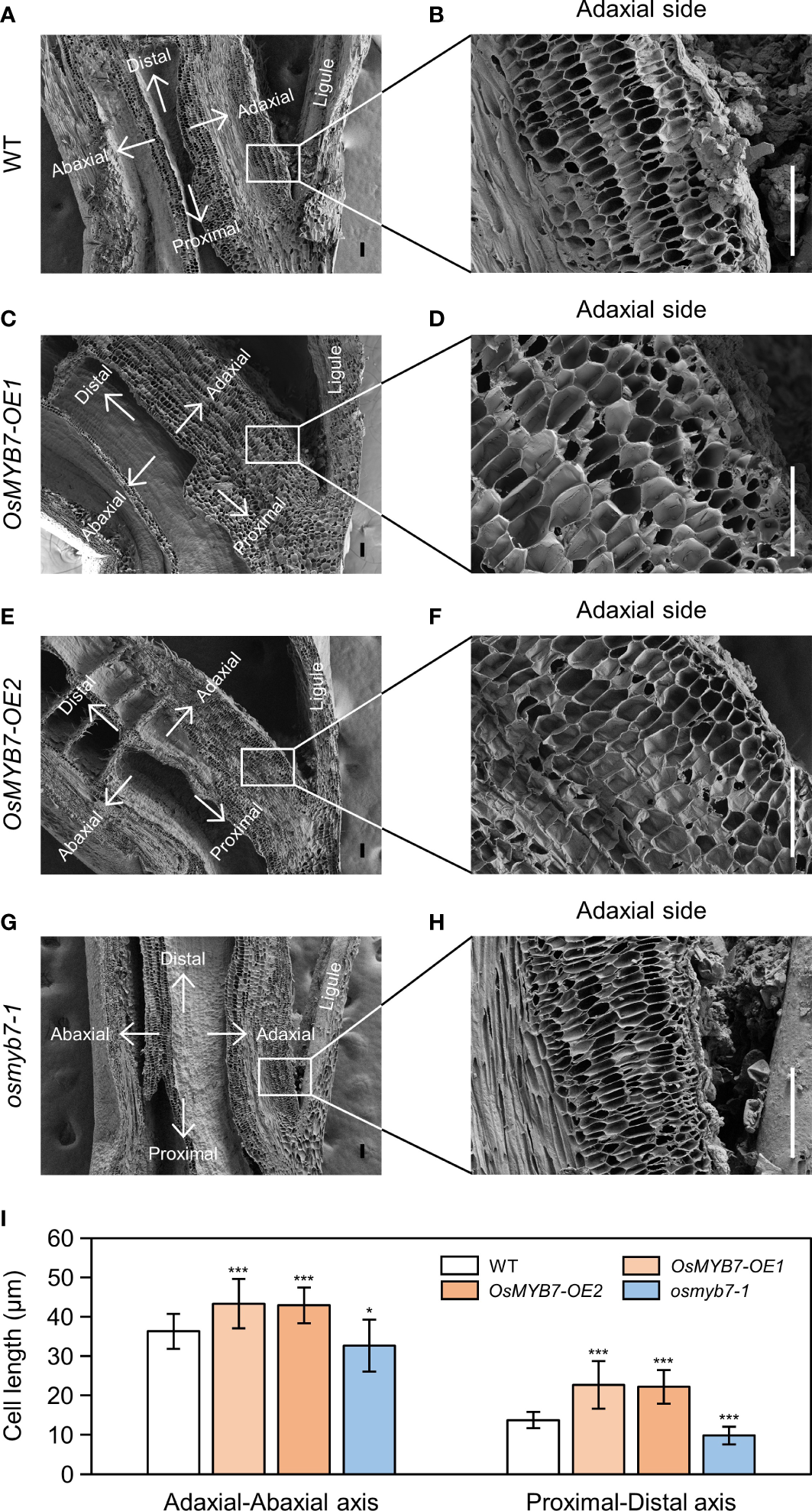 Scanning electron microscopy examination of the lamina joint. (A–H) Longitudinal sections of flag leaf lamina joints at the S5 developmental stage in WT (A), OsMYB7-OE1(C), OsMYB7-OE2(E), and osmyb7-1(G) plants grown under natural long-day conditions in a paddy field. Close-up views of the adaxial region denoted by rectangles in (A, C, E, G) are shown in (B, D, F, H), respectively. Scale: 100 μm. (I) Adaxial cell length in (B, D, F, H). Length of the adaxial cells was measured along the adaxial-abaxial axis and proximal-distal axis. Data are presented as means ± SD from 30 cells. Asterisks indicate significant differences compared to WT, as determined by two-tailed Student’s t-test (*P < 0.05 and ***P < 0.001). Similar results were obtained from at least three independent samples.