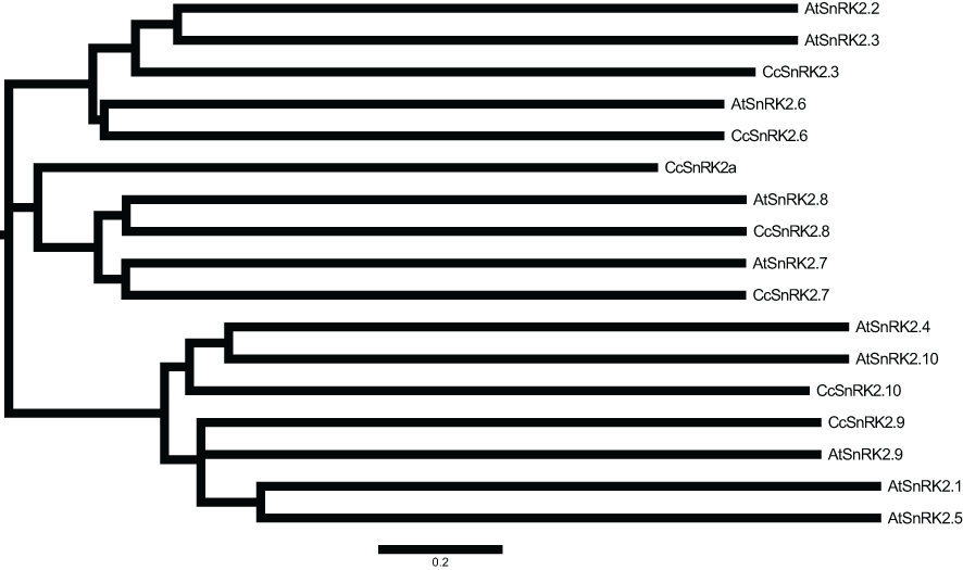 Phylogenetic tree of SnRK2 proteins from Citrus clementina and Arabidopsis thaliana CcSnRK2s: C. clementina; AtSnRK2s: A. thaliana. The scale bar was the distance scale.
