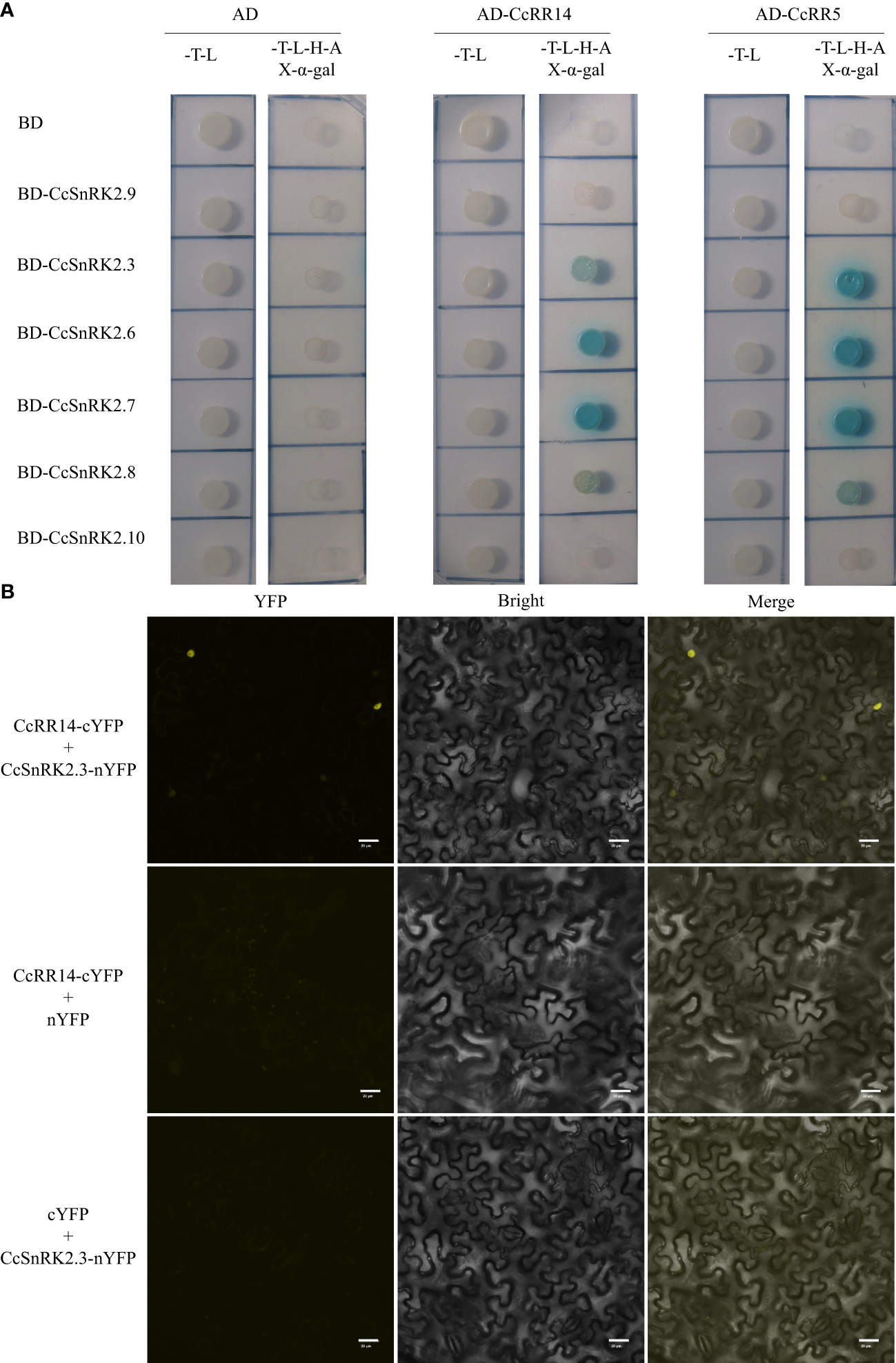 Interactions between CcRR5, CcRR14, and CcSnRK2s proteins. (A) Yeast two-hybrid assays between CcRR5, CcRR14, and CcSnRK2s. SD/-T-L, synthetic dropout medium lacking Trp and Leu. SD/-T-L-H-A, synthetic dropout medium lacking Trp, Leu, His, and Ade. (B) BiFC assays between CcRR14 and CcSnRK2.3. YFP, YFP fluorescence; merge, merge of YFP fluorescence; bright field image. Bars = 20 µm. .