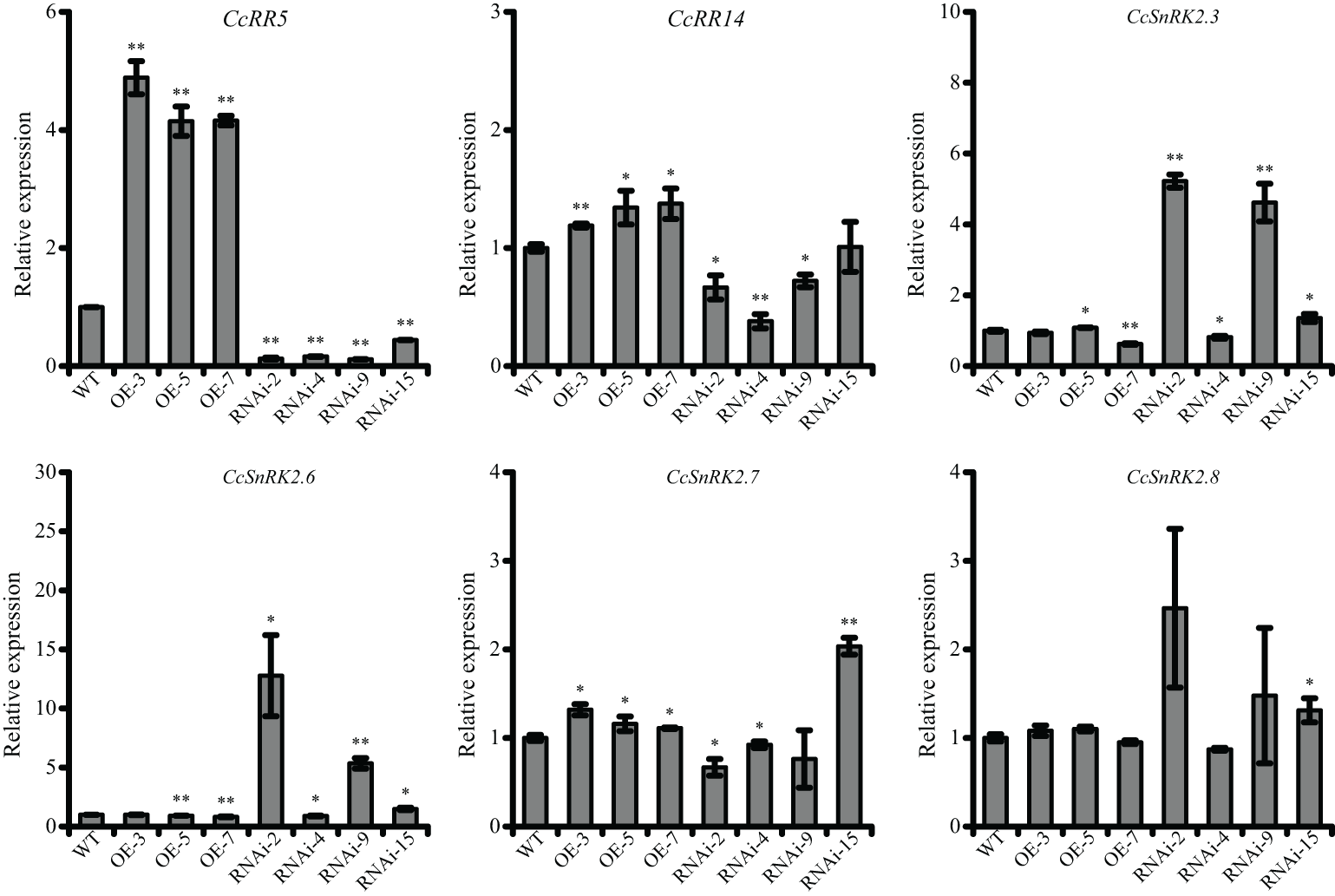 The expression level of CcRR5, CcRR14, and CcSnRK2s in transgenic plants. WT, wild type; OE, CcRR5 overexpression plants; RNAi, CcRR5 silence plants. Each error bar indicated the mean ± SD (n = 3). The asterisk indicated that the expression of CcRRs or CcSnRK2s in overexpression and silence plant was significantly different with that in the WT plants, *p < 0.05; **p < 0.01.