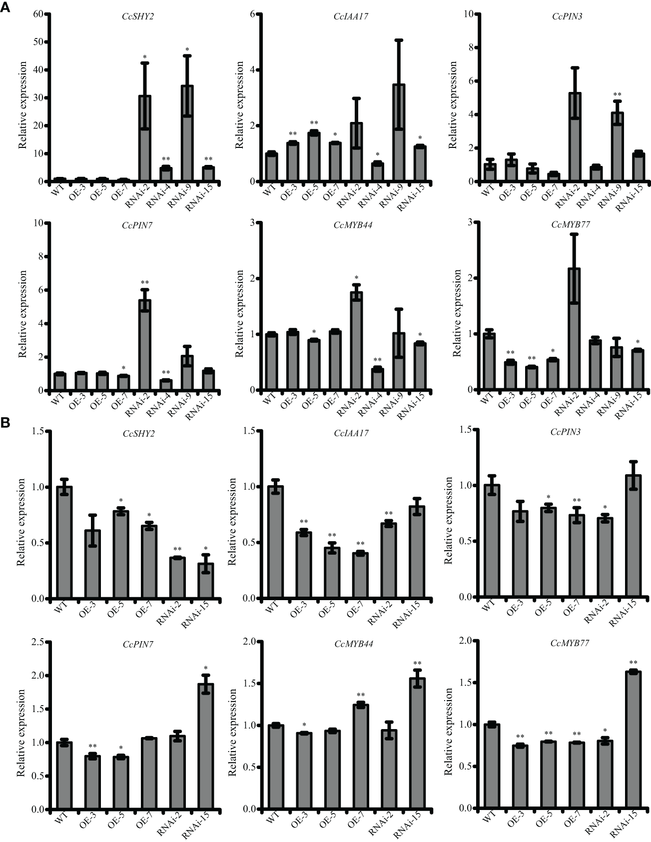 The expression levels of root-related genes in the leaves (A) and roots (B) of CcRR5 transgenic plants. WT, wild type; OE, CcRR5 overexpression plants; RNAi, CcRR5 silence plants. Each error bar indicated the mean ± SD (n = 3). The asterisk indicated that the expression of genes in overexpression and silence plant was significantly different with that in the WT plants. *p < 0.05; **p < 0.01.
