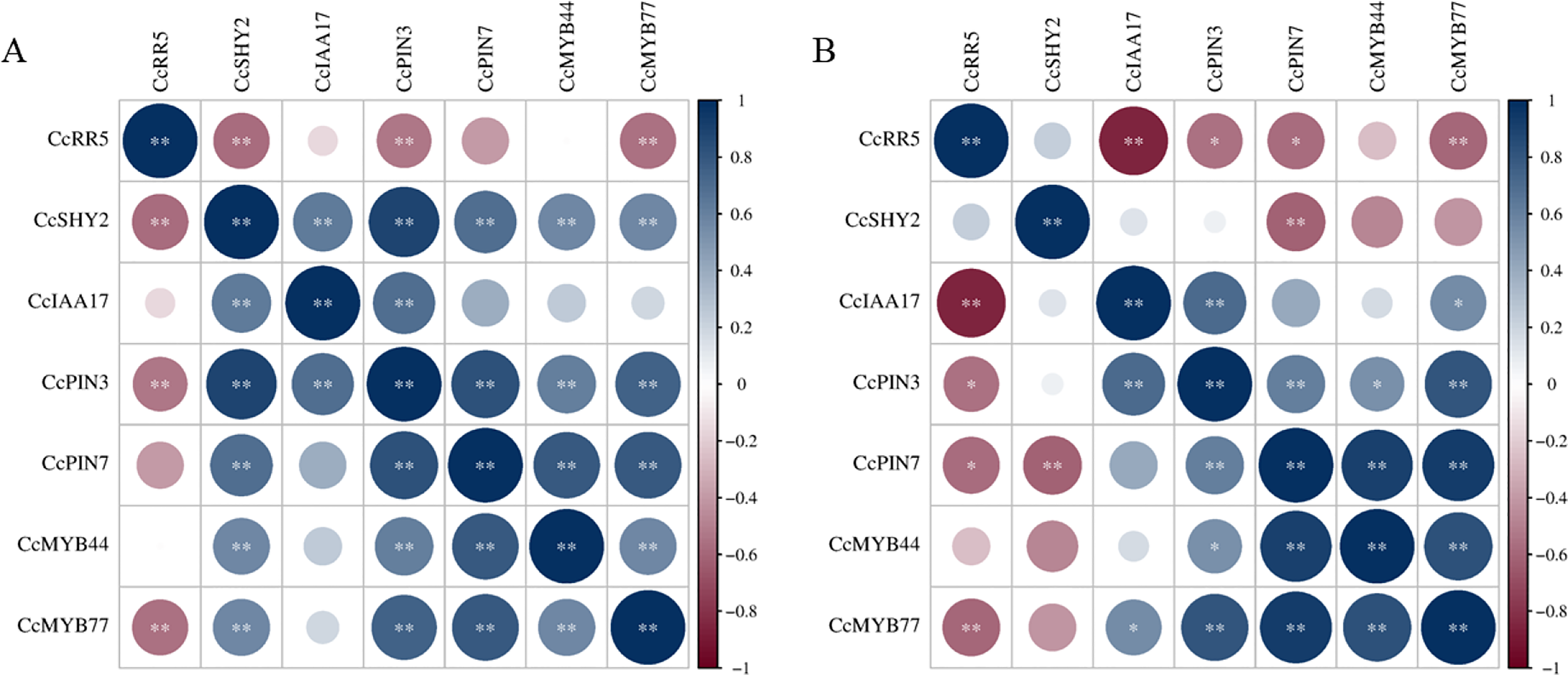 The correlation between expressions of CcRR5 and root-related genes in the leaves (A) and roots (B) of CcRR5 transgenic plants. The color bar represented the range of correlation coefficient (r). *p < 0.05; **p < 0.01.