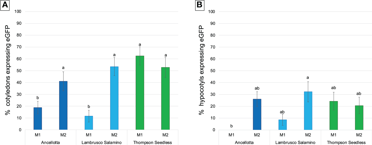Frequency (%) of calli expressing eGFP fluorescence obtained from cotyledons (A) and hypocotyls (B) of Ancellotta, Lambrusco Salamino, Thompson Seedless under UV light on the total number of treated explants, at 9 weeks after infection. These explants were cultured on regeneration/selection media M1 and M2 supplemented with 146 µM kanamycin, 420 µM cefotaxime, and 475 µM carbenicillin. Means with different letters are significantly different according to the Student-Newman-Keuls (p ≤ 0.05) ± SE (n=50).