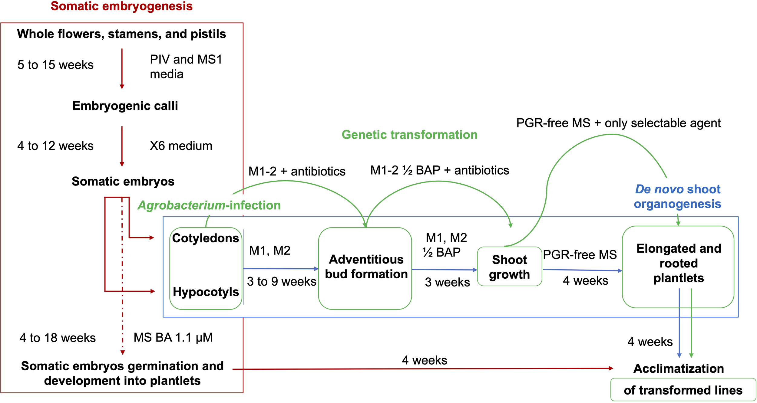 Schematic representation of the regeneration methods and Agrobacterium-mediated transformation protocols from cotyledons and hypocotyls obtained from flower-derived somatic embryos of grapevine cultivars. Embryogenic calli are obtained from the culture of whole flowers, stamens, and pistils on PIV and MS1 media. These calli are continuously proliferated on X6 medium, with the production of somatic embryos at the cotyledonary stage. The somatic embryogenesis regeneration pathway is interrupted through the isolation of cotyledons and hypocotyls from the somatic embryos, which are separated and induced to form adventitious shoots on appropriate regeneration media (M1 and M2). Shoot development occurs in media with halved BAP concentrations, while the elongation and the emergence of roots are stimulated from the shoots in a PGR-free MS medium, which is followed by the acclimatization in the greenhouse. Agro-infected cotyledons and hypocotyls chase the same steps for the stimulation of de novo shoot formation, in media supplemented with 420 µM cefotaxime, 475 µM carbenicillin, and 146 µM kanamycin.