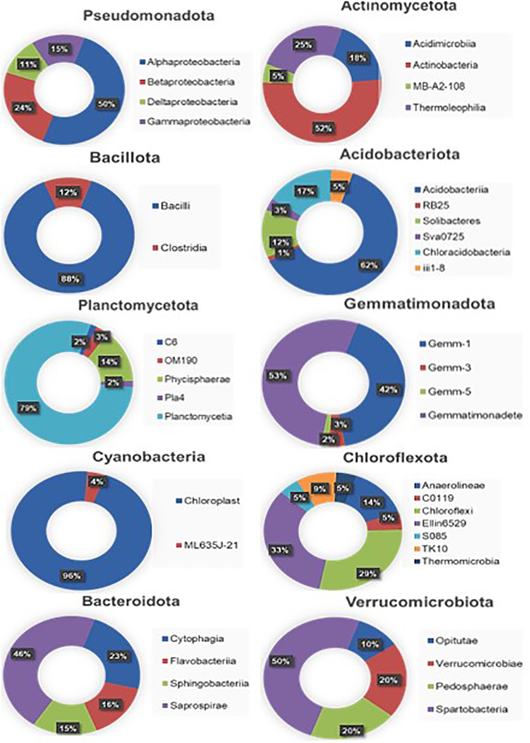 Among the Pseudomonadota, alphaproteobacteria (> 50%) were the dominant class followed by betaproteobacteria (> 24%), gammaproteobacteria (> 15%), and deltaproteobacteria (>11%) (Figure 2). In the case of Actinomycetota, the Actinobacteria (> 52%) class had the highest dominance followed by Thermoleophilia (> 25%). Similarly, in Bacillota and Planctomycetota, Bacilli (> 88%) and Panctomycetia (> 79%) have the highest dominance, respectively. In Acidobacteriota, 6 classes were identified, among which Acidobacteriia (> 62%) had the highest abundance. Furthermore, among Gemmatimonadota, Bactteroidota, and Verrucomicrobiota, Gemmatimonadetes (> 53%), Saprospirae (> 46%), and Spartobacteria (> 50%), respectively were found dominant. Phylum Chloroflexota showed the existence of a maximum of 7 classes with the dominance of candidate class Ellin6529 (> 33%) followed by Chloroflexi (>29%).