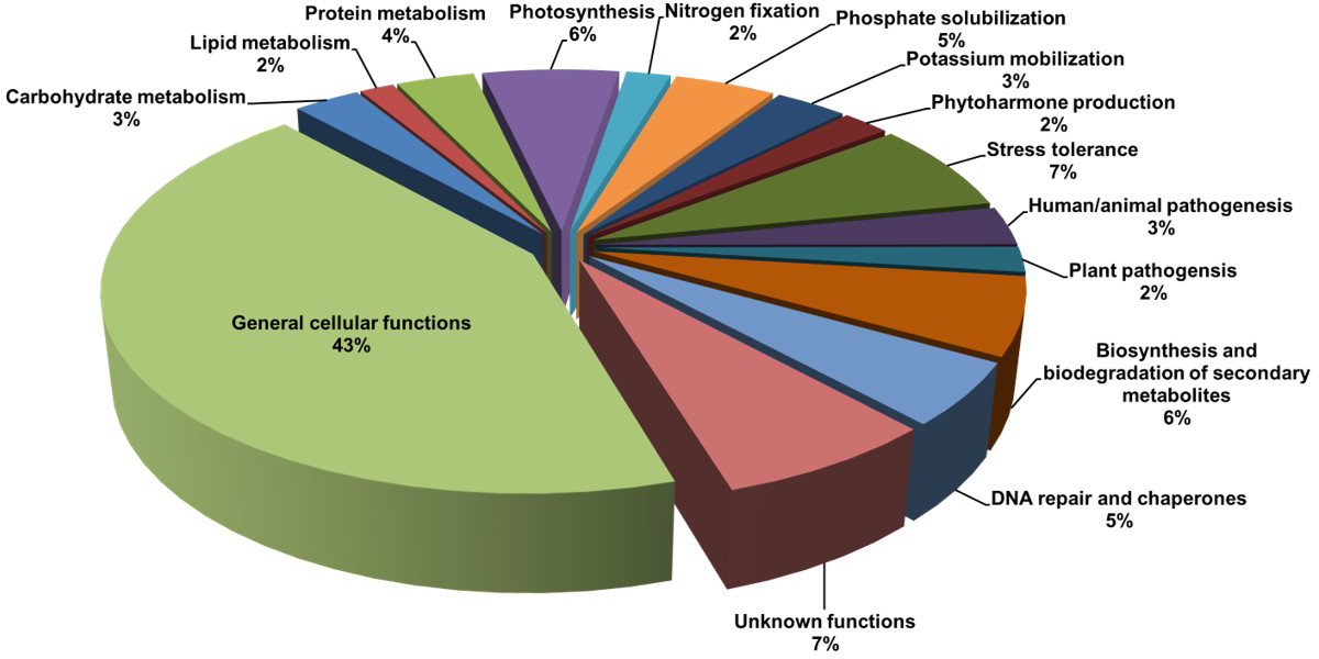 PICRUSt analysis predicted various functional traits in the soil metagenome (Figure 4). The majority of the OTUs were found associated with General cellular functions (> 43%) followed by stress tolerance (>7%). The other dominant functions were photosynthesis (> 6%), biosynthesis and biodegradation of secondary metabolites (> 6%), and DNA repair (> 5%). The analysis also predicted the functions associated with plant growth promotion, viz., phosphate solubilization (>5%), potassium mobilization (3%), and nitrogen fixation (2%) in the rhizosphere of L. camara L. A good proportion of the OTUs were found associated with unknown functions (> 7%).