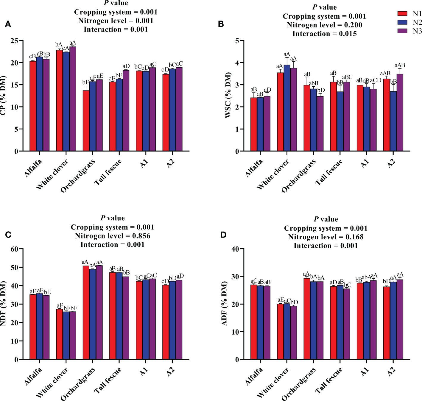 Effect of N input on the nutritional quality of different cropping systems. (A) Crude protein, (B) water-soluble carbohydrates, (C) neutral detergent fiber, and (D) acid detergent fiber. A1, mixture of alfalfa, tall fescue, and orchardgrass; A2, mixture of alfalfa, white clover, tall fescue, and orchardgrass; N1, 150 kg ha-1; N2, 300 kg ha-1; N3, 450 kg ha-1. The bars show the standard errors. Lowercase letters represent the significant difference within the same cropping system under various N inputs, while uppercase letters indicate the significant difference within different cropping systems under the same N input. Significance was employed at 0.05.