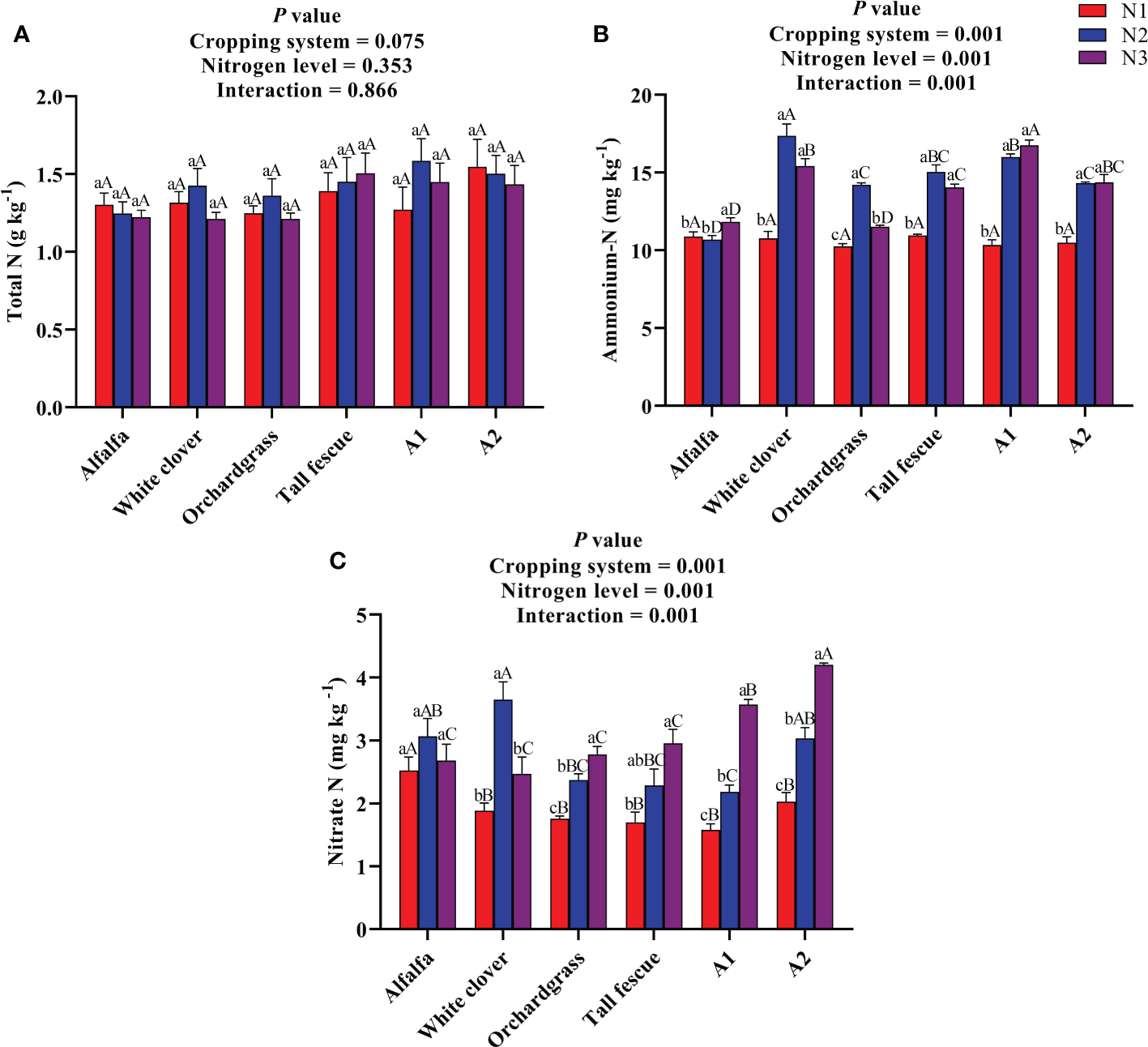 Effect of N input on the soil nutrients of different cropping systems. (A) Total N, (B) ammonium N, and (C) nitrate N. A1, mixture of alfalfa, tall fescue, and orchardgrass; A2, mixture of alfalfa, white clover, tall fescue, and orchardgrass; N1, 150 kg ha-1; N2, 300 kg ha-1; N3, 450 kg ha-1. The bars show the standard errors. Lowercase letters represent the significant difference within the same cropping system under different N inputs, while uppercase letters indicate the significant difference within different cropping systems under the same N input. Significance was employed at 0.05.