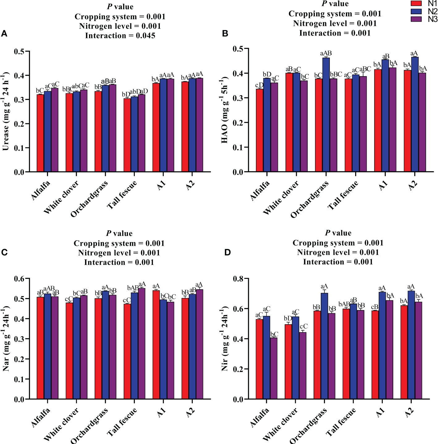 Effect of N input on the soil enzyme activities of different cropping systems. (A) Urease, (B) hydroxylamine oxidoreductase, (C) nitrate reductase, and (D) nitrite reductase. A1, mixture of alfalfa, tall fescue, and orchardgrass; A2, mixture of alfalfa, white clover, tall fescue, and orchardgrass; N1, 150 kg ha-1; N2, 300 kg ha-1; N3, 450 kg ha-1. The bars show the standard errors. Lowercase letters represent the significant difference within the same cropping system under different N inputs, while uppercase letters indicate the significant difference within different cropping systems under the same N input. Significance was employed at 0.05.