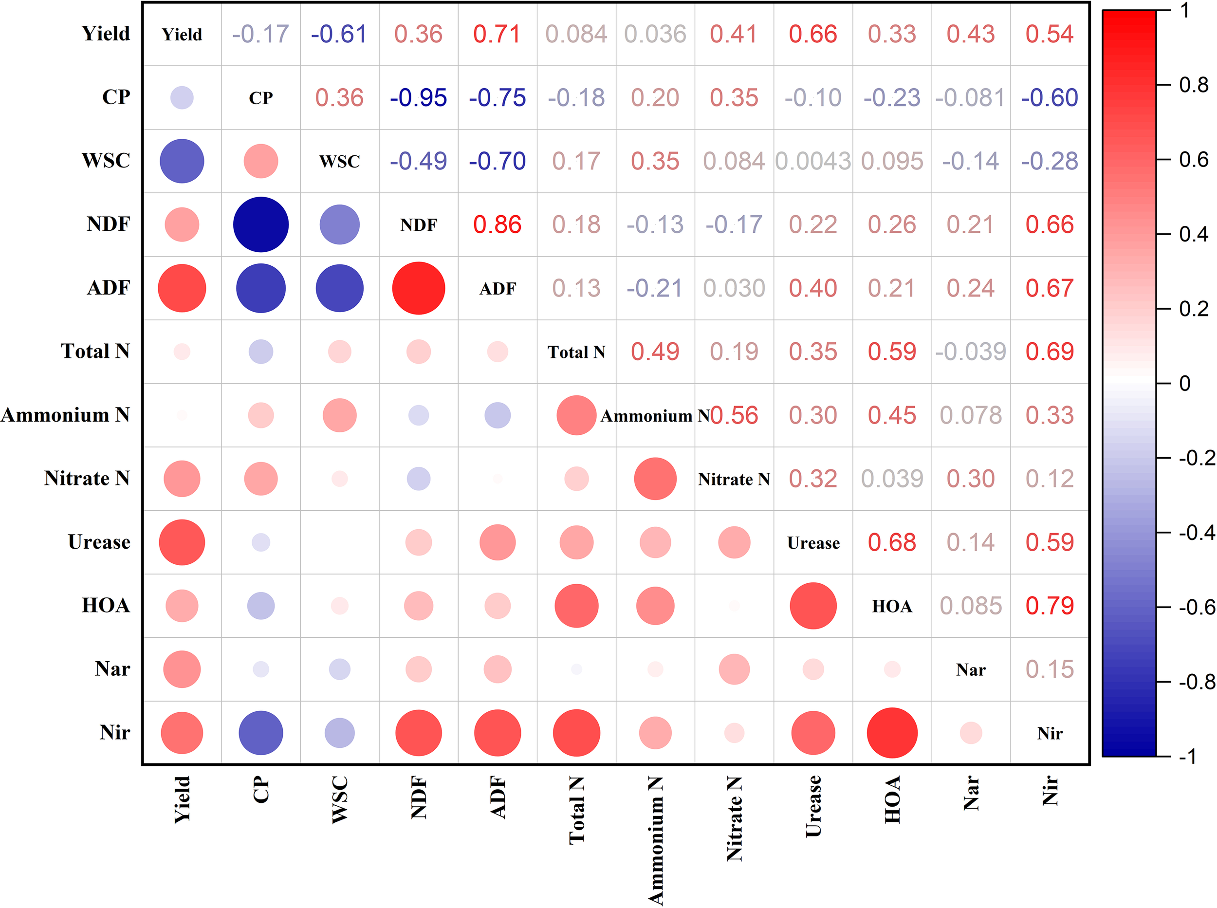 Associations among forage yield and nutritional quality, soil nutrients, and soil enzyme activities. CP, crude protein; WSC, water-soluble carbohydrates; NDF, neutral detergent fiber; ADF, acid detergent fiber; HAO, hydroxylamine oxidoreductase; Nar, nitrate reductase; and Nir, nitrite reductase.