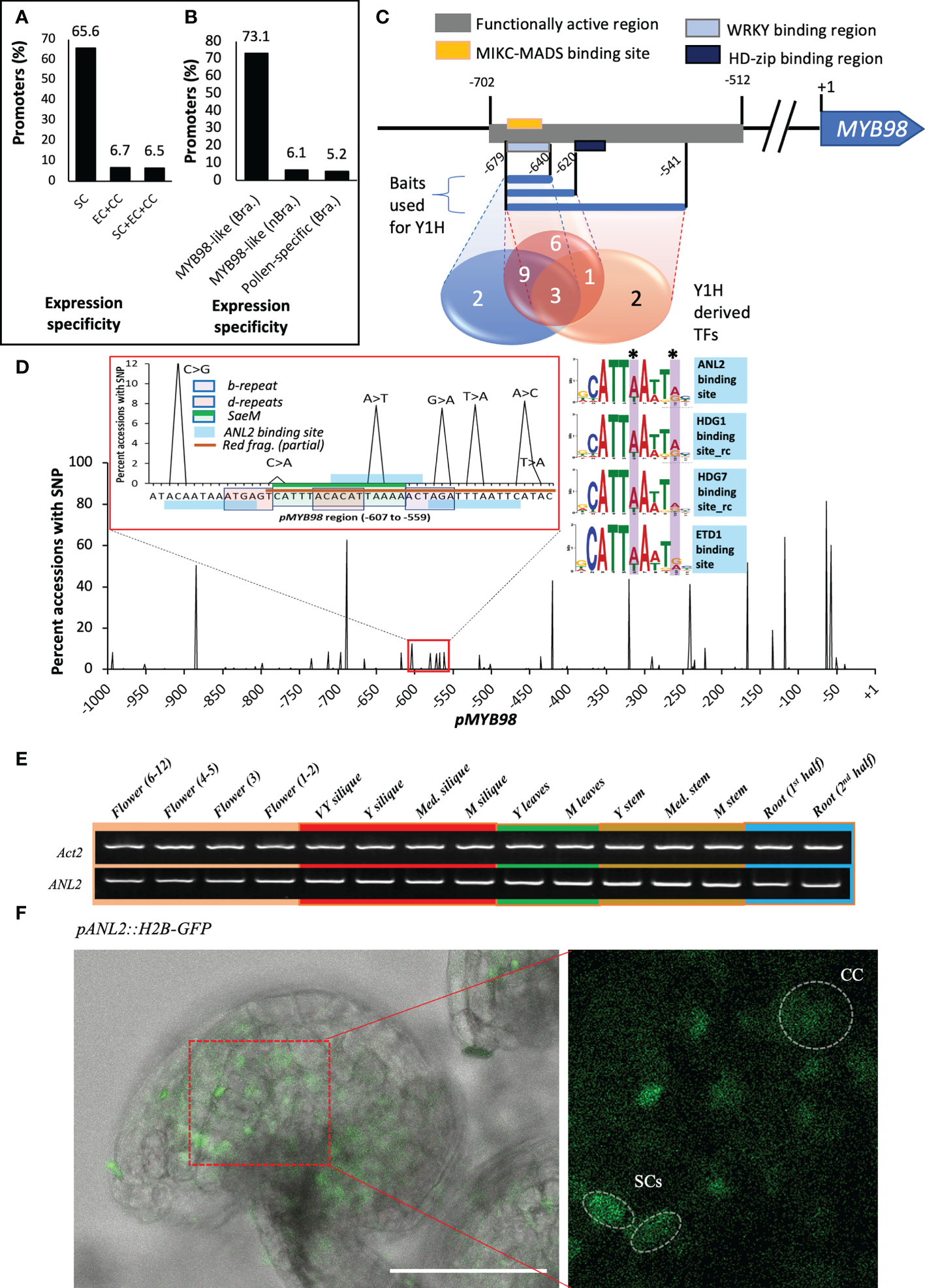 Figure 5 SaeM is conserved among Brassicaceae members and is recognized by ANL2 and its homologs. (A) An excessively higher proportion of SC-specific gene promoters harbor SaeM-like element as compared with those expressed either at all female gametophyte component cells or exclusively at CC and EC. (B) A significantly high proportion of Brassicaceae-derived pMYB98 harbor SaeM-like element as compared with their non-Brassicaceae counterparts and Arabidopsis derived pollen-specific gene promoters (-ve control). (C) TF-binding sites predicted by the PlangRegMap (in square boxes) and the number of TFs derived from yeast-1-hybridization (Y1H) with three independent overlapping fragments as baits (in Venn diagram). (D) SNP frequency within 1 kb of pMYB98 among 1,135 Arabidopsis accessions. The SaeM, within/nearby repeat-sites used for mutation studies, and ANL2-binding sites are highlighted in the magnified graph in inset. The web logos of respective recognition sites of ANL2 and its homologs (HDG1, HDG7, and ETD1) are shown on the side marking and highlighting the base positions with SNPs. (E) ANL2 is expressed in all plant tissues assessed in Arabidopsis. (F) Weak GFP-signals at SCs and CCs in pANL2::H2B-GFP mature ovule (retrieved from Flower stage 3). GFP intensity was enhanced for visualization purpose; check the associated z-stack-derived movie in Supplementary Movie S3. Scale bar = 50 μm. SC, synergid cell; CC, central cell; EC, egg cell.