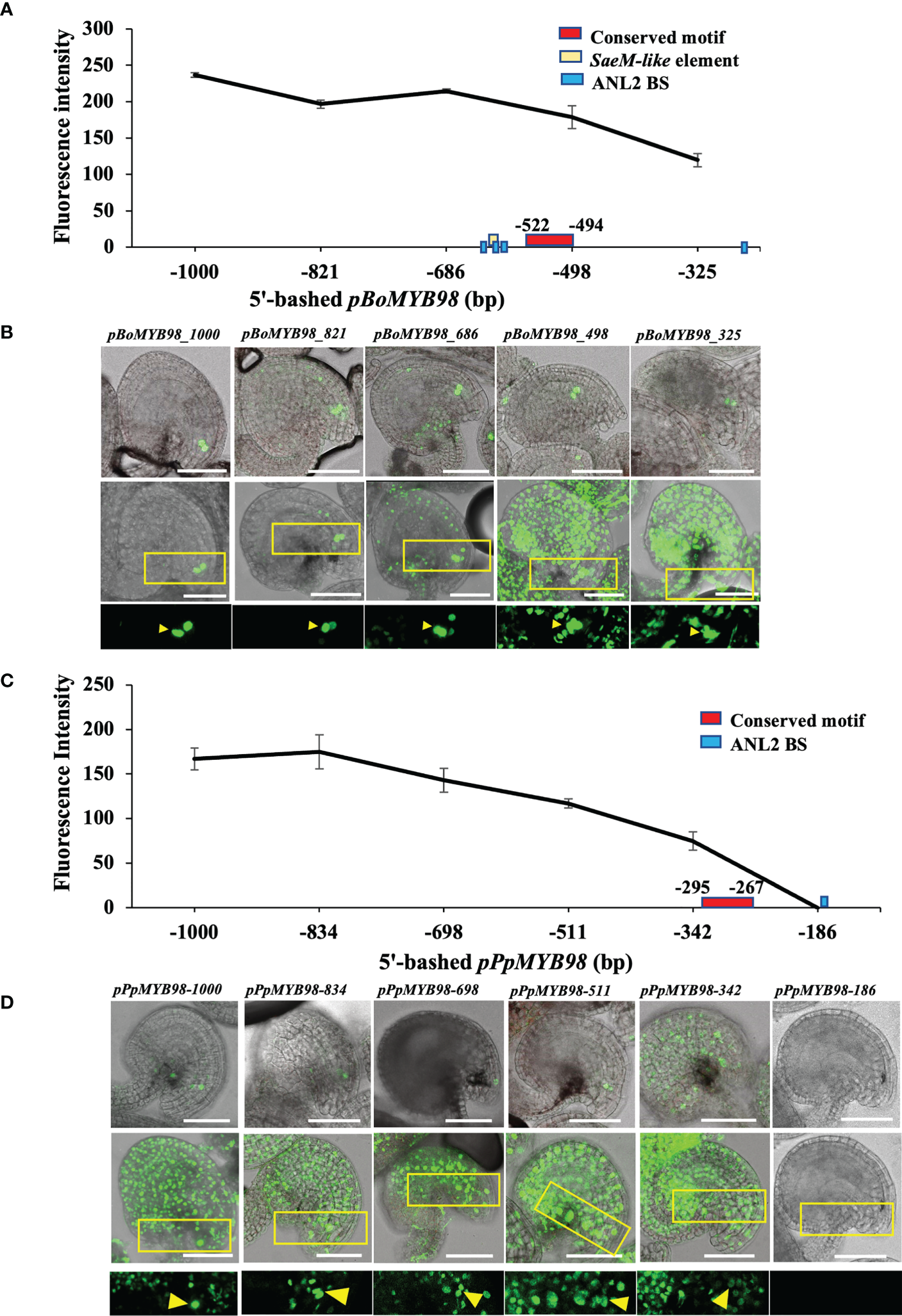 To confirm whether such conservation is translated into in vivo expression of respective MYB98, we selected cabbage (Brassica oleracea; Brassicaceae) derived MYB98 (BoMYB98; Bol029896) and peach (Prunus persica; Rosaceae) derived MYB98 (PpMYB98; Prupe.5G172400) to assess 5′-promoter deletion reporter series in Arabidopsis. The two were selected based on their relatively distant and closer clustering with pAtMYB98 (Kindly check Figure 2A and Supplementary Figure S2). While both promoters exhibited a gradual drop in reporter signal with decreasing promoter length, only pBoMYB98 exhibited exclusive SC-specific expression with a 1 kb promoter fragment which was largely retained with −821 and −686 promoter fragments as well. However, the lines harboring −498 and −325 bp promoter fragments completely lost exclusive SC-specific expression. Both of the-498 and -325 bp pBoMYB98 fragments completely lacked the region harboring SaeM-like element, multiple ANL2-binding sites, and the MEME-derived conserved site (Figures 6A, B). pPpMYB98, which lacked a SaeM-like element and harbored only one ANL2-recognition motif, failed to exhibit exclusively SC-specific expression even with its 1 kb promoter fragment (Figures 6C, D) supporting the finding that SaeM and multiple ANL2-binding sites are required for SC-specific expression in Arabidopsis. Furthermore, our earlier mutation and fragment combination observations showed that the TF binding within the SaeM-like element is more crucial than that at any other sites for exclusive SC-specific as well as overall reporter expression levels (Figures 3, 4).
