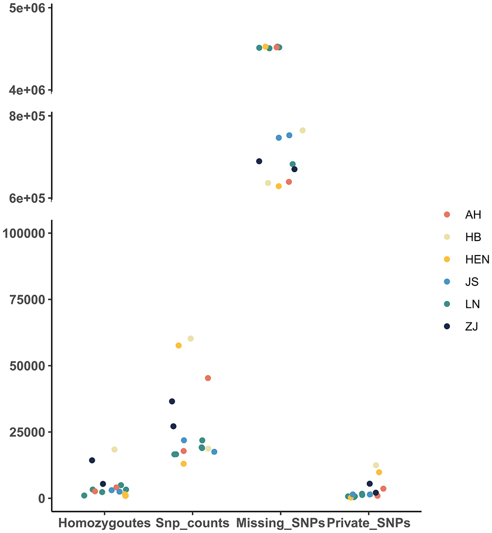 Box plots of SNP genotypes among 15 B xylophilus isolates. AH refers to Anhui isolates, HB to Hubei isolates, HEN to Henan isolates, JS to Jiangsu isolates, LN to Liaoning isolates, and ZJ to Zhejiang isolates. The same is shown below.