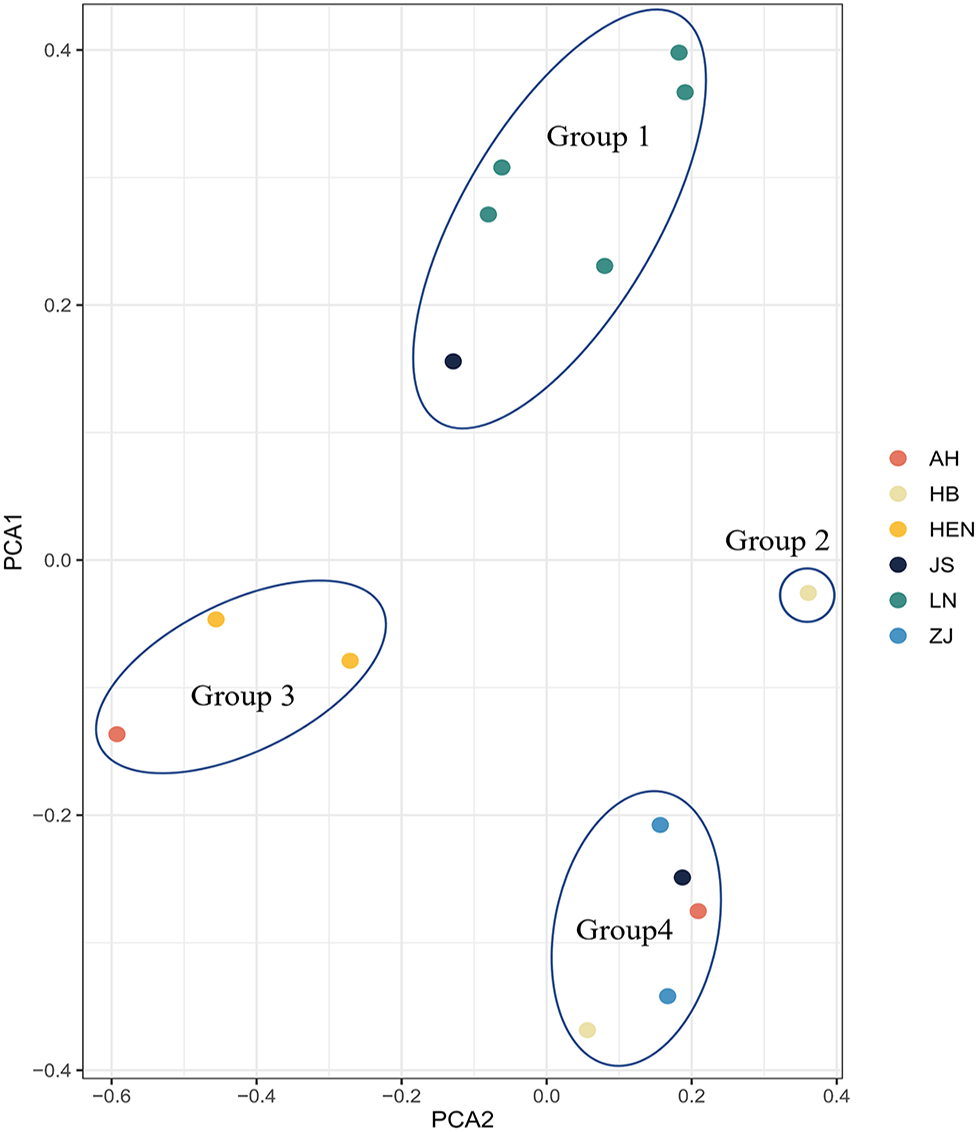 PCA exhibited that the 15 PWN isolates from Liaoning, Anhui, Hubei, Henan, Jiangsu and Zhejiang Provinces could be divided into four groups (Figure 4). Group 1 included all Liaoning isolates and one Jiangsu isolate (JS20). Group 2 included only one strain, HB06. Group 3 comprised all Henan isolates and one Anhui strain (AH32). Group 4 contained a total of 5 isolates, including all Zhejiang isolates, one Hubei isolate, one Jiangsu isolate (JS08) and one Anhui isolate (AH03). The above findings were supported by the phylogenetic tree constructed based on SNP loci (Figure 5). Isolates from Liaoning showed obviously distinct genetic variations when compared with others.