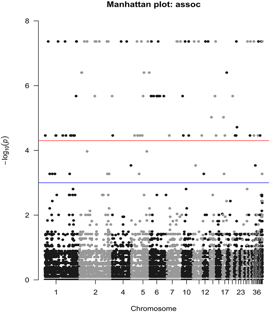 Manhattan plot of SNPs strongly associated with low-temperature tolerance. The blue line is the genome-wide suggestive line = −log10(1e-03); the red line is the genome-wide significance line = −log10(5e-05).