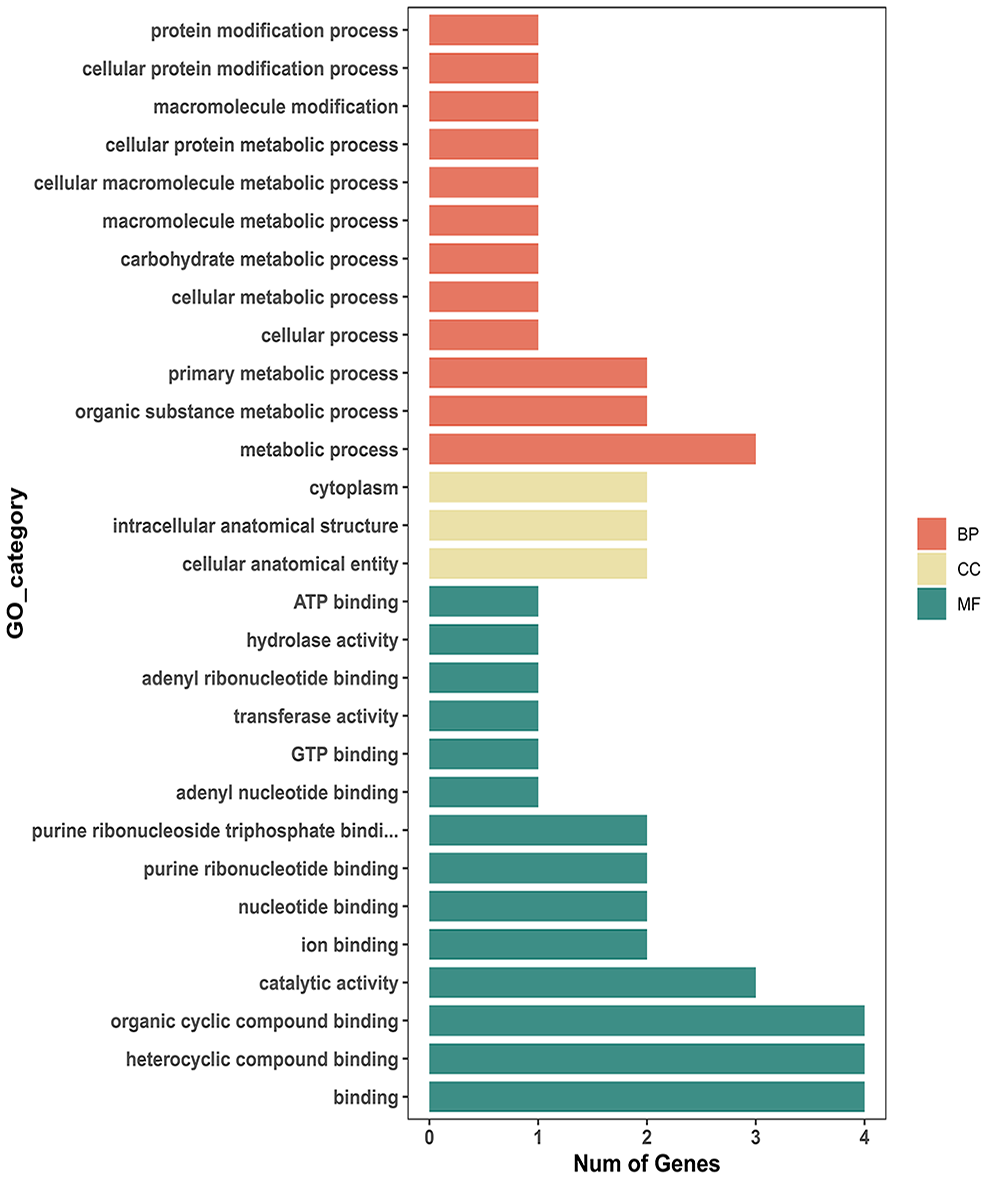 The reproductivity and population genetics results suggested that the low-temperature adaptability of Liaoning isolates was different from that of other isolates. Therefore, we searched for SNPs related to tolerance of low temperatures or other environmental stresses in Liaoning isolates using genome-wide association analysis. A total of 277 significantly associated SNPs were detected (P <0.001), 24 of which were located in exons (Figure 6). 64% of these exonic SNPs were identified as nonsynonymous SNPs, which will change the protein sequences. Highly associated SNPs (nonsynonymous) were found in the 7TM GPCR (bx1.05233-RA, Contig004:6330970), Acyl-CoA (bx1.12564-RA, Contig245:176) and Chaperonin-Cpn10 (bx1.12514-RA, Contig125:14605) families, which may have a notable correlation with temperature adaptation. The Sanger sequencing result of aforementioned SNPs were conssitent with our genome resequencing data (Figure S2). GO enrichment analysis also suggested that the identified SNPs were involved in protein modification or metabolic processes (Cpn10 involved) and GTP binding (GPCR involved). Other proteins, such as ATPase, are related to the regulation of the adaptation and growth of B. xylophilus via catalytic activity and metabolic processes (Figure 7).