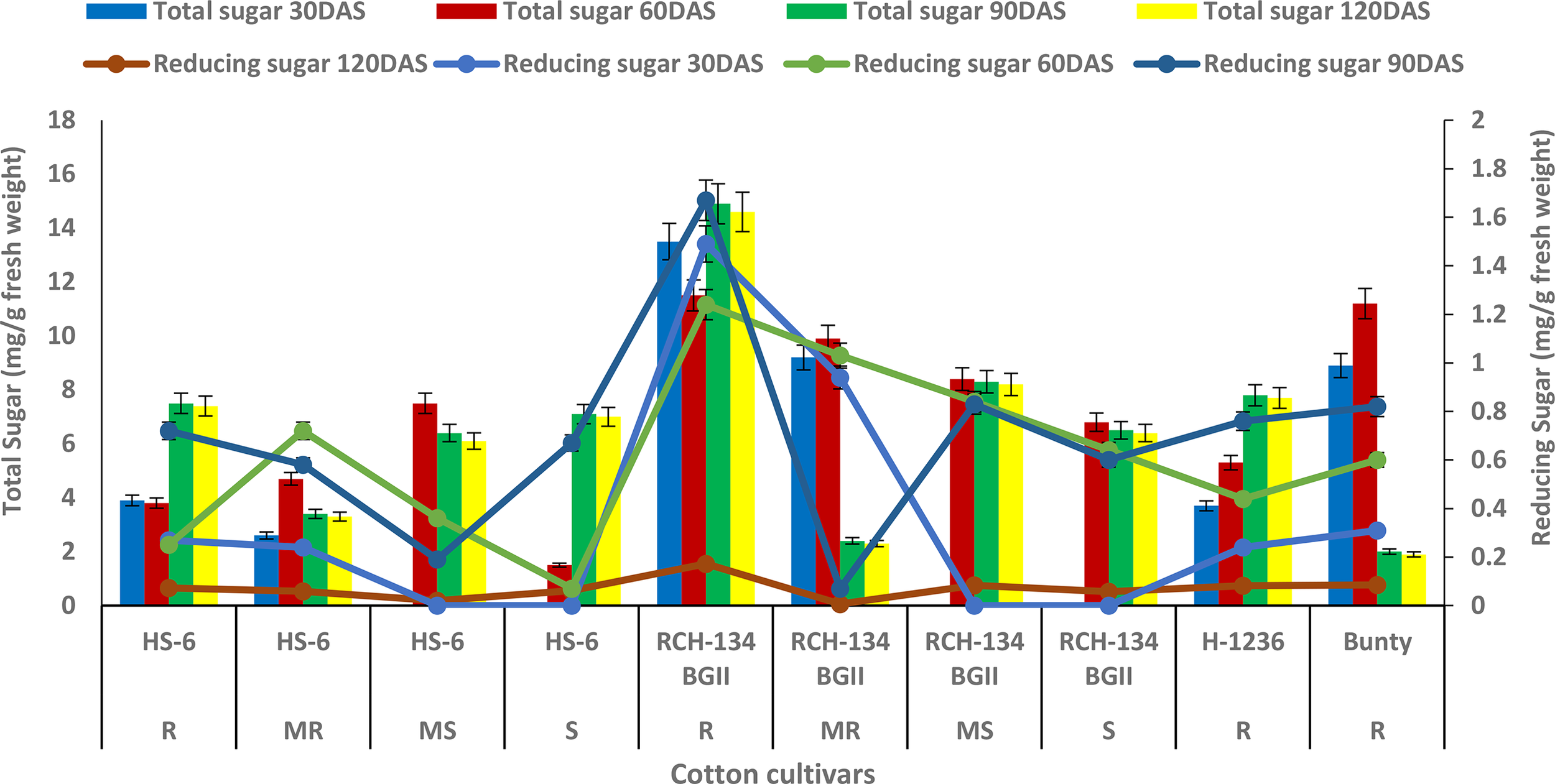 Total sugar (bars) and reducing sugar (lines) in cotton cultivars estimated at 30, 60, 90, and 120 days after sowing. The susceptible cultivars were Non-Bt (HS 6) and Bt (RCH 134 BGII). Non-Bt H1236 and Bt Bunty were taken as resistant cotton cultivars.