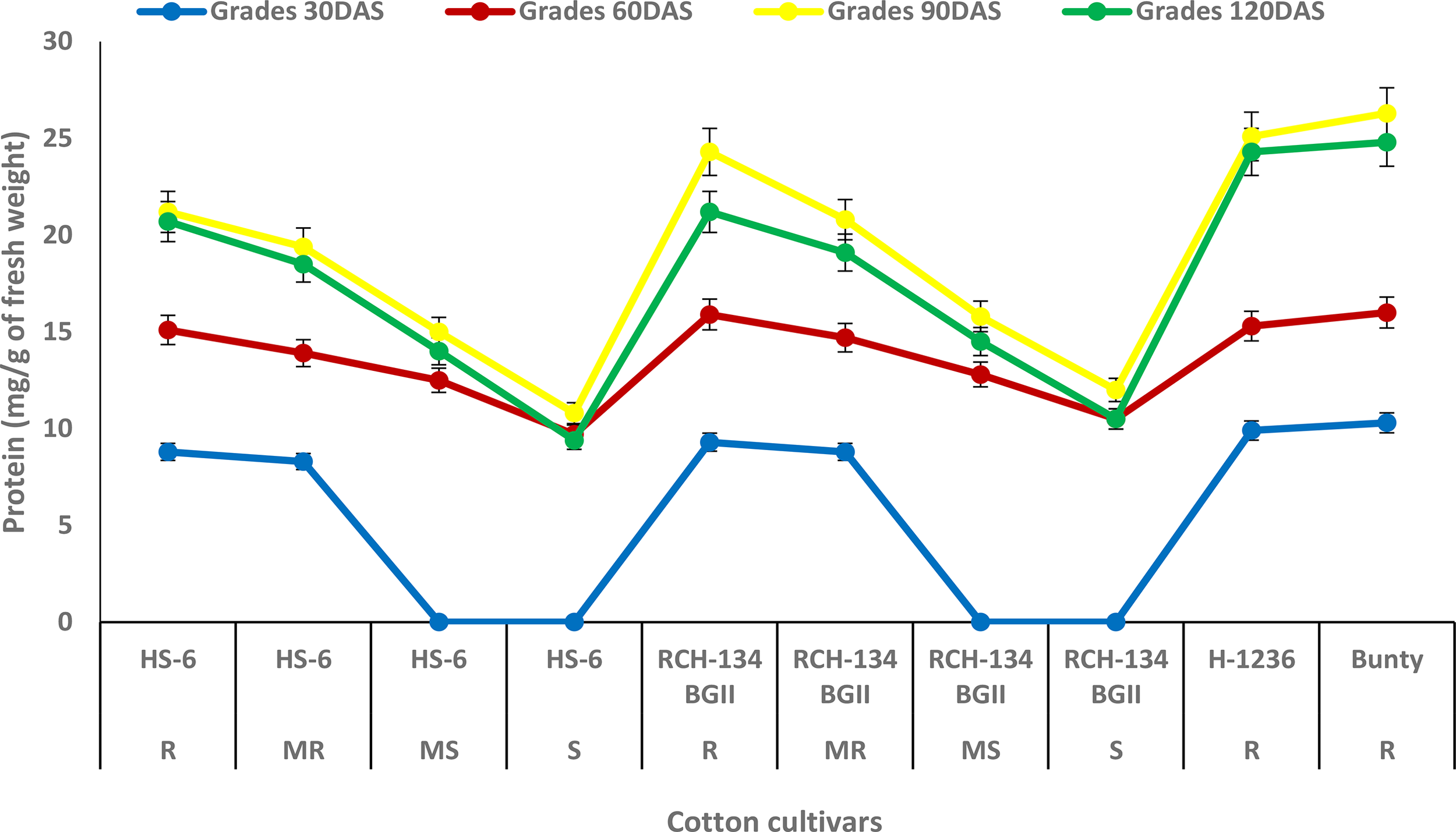 Protein content in cotton cultivars estimated at 30, 60, 90, and 120 days after sowing. The susceptible cultivars were Non-Bt (HS 6) and Bt (RCH 134 BGII). Non-Bt H1236 and Bt Bunty were taken as resistant cotton cultivars.