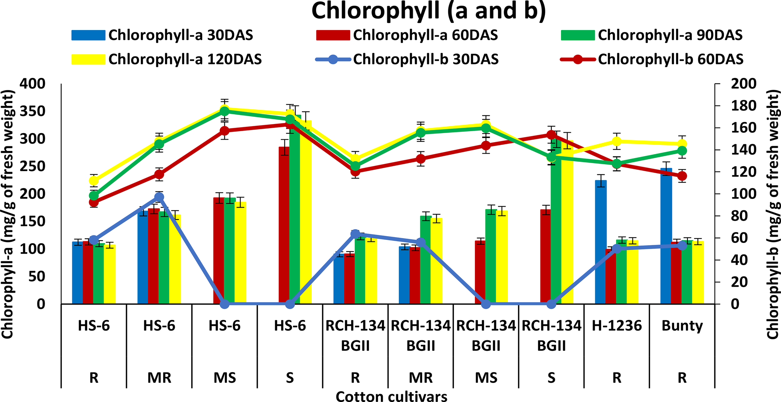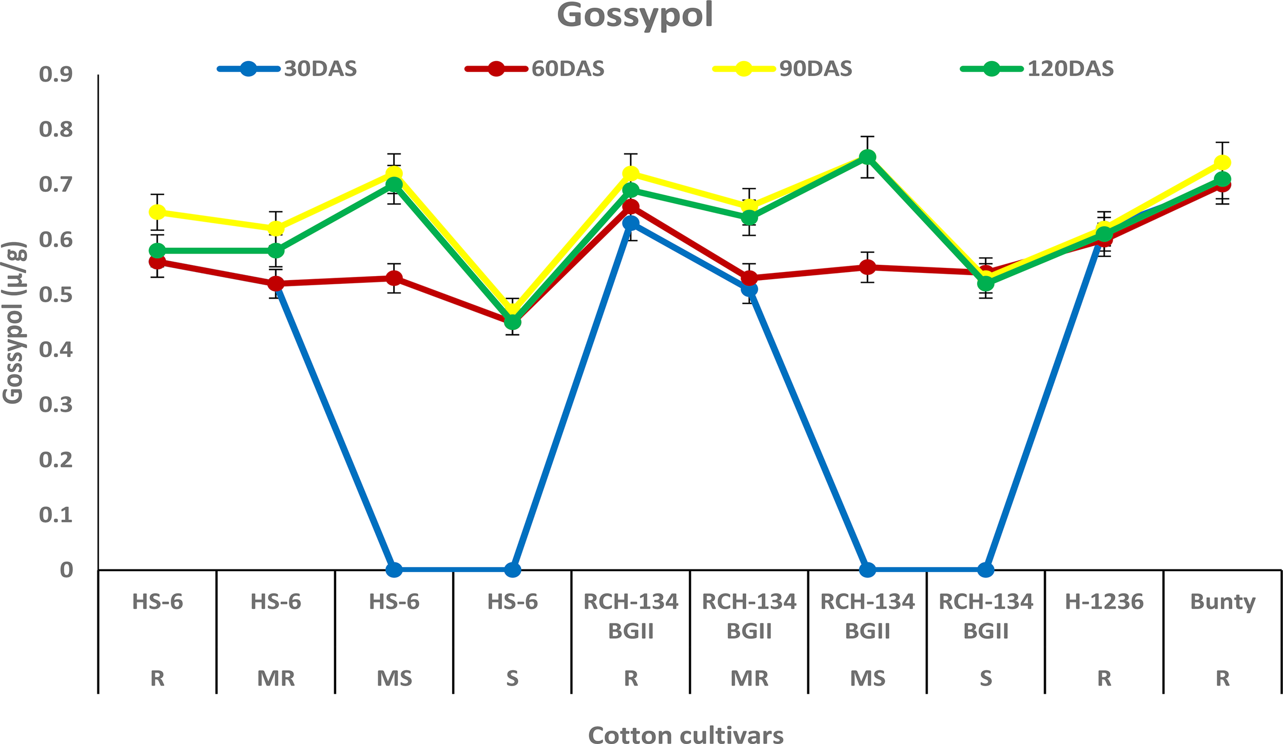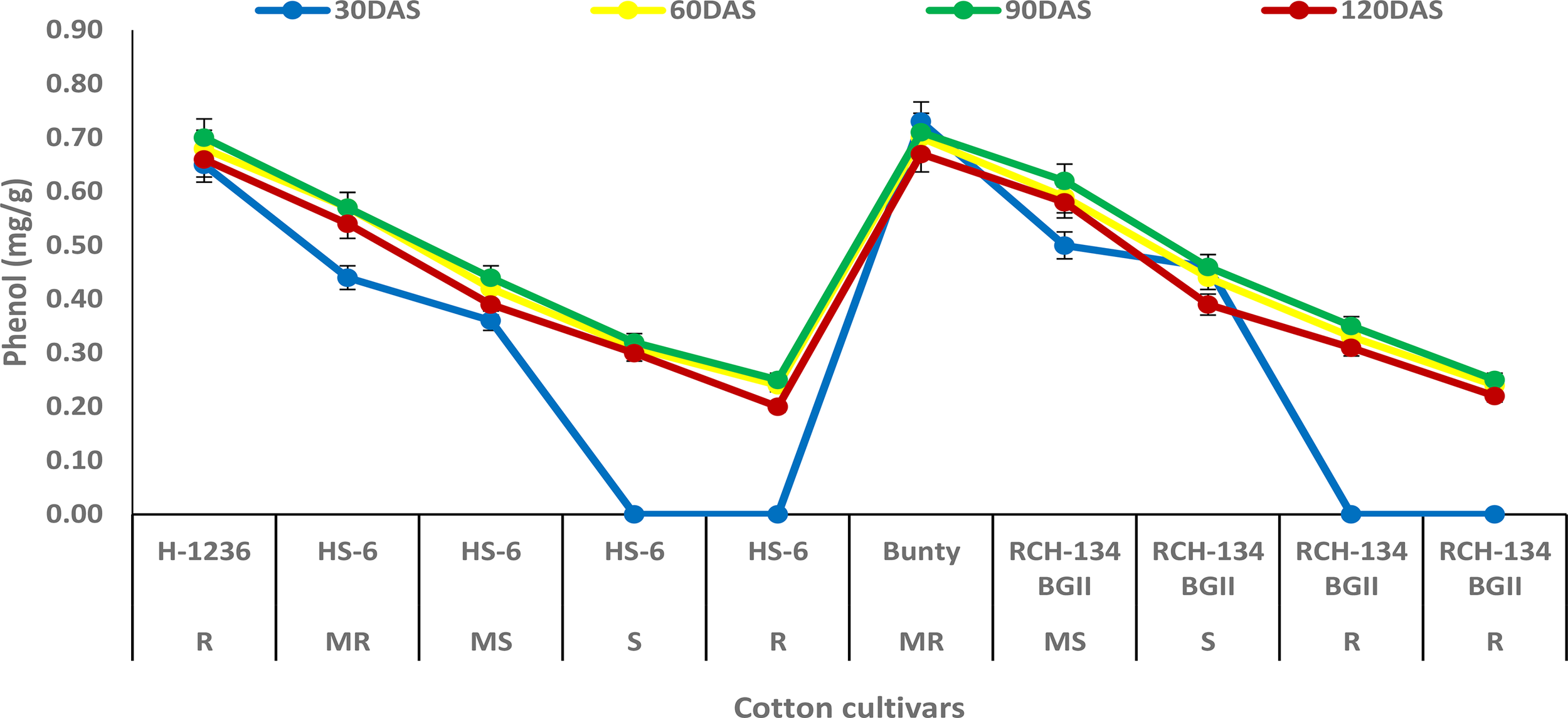 Reducing sugar in the healthy plants of the susceptible Bt cultivar RCH 134 BG-II exhibited the highest value of 1.67 mg/g at 90 days. In contrast, the lowest value of 0.07 mg g-1 was observed at 60 DAS in the highly diseased plants of the susceptible hybrid HS 6. Higher phenol content (0.70 mg g-1) was observed at 90 DAS in resistant cultivars, whereas highly susceptible plants exhibited the least phenol (0.25 mg g-1) at 90 DAS. The lowest protein activity was observed at 120 DAS in susceptible cultivars HS 6 (9.4 mg g-1) followed by RCH 134 BG-II (10.5 mg g-1). However, other biochemical compounds, including chlorophyll, sugar, and gossypol, did not show a significant role in resistance against CLCuV. The disease progression analysis in susceptible cultivars revealed non-significant differences between the two susceptible varieties.