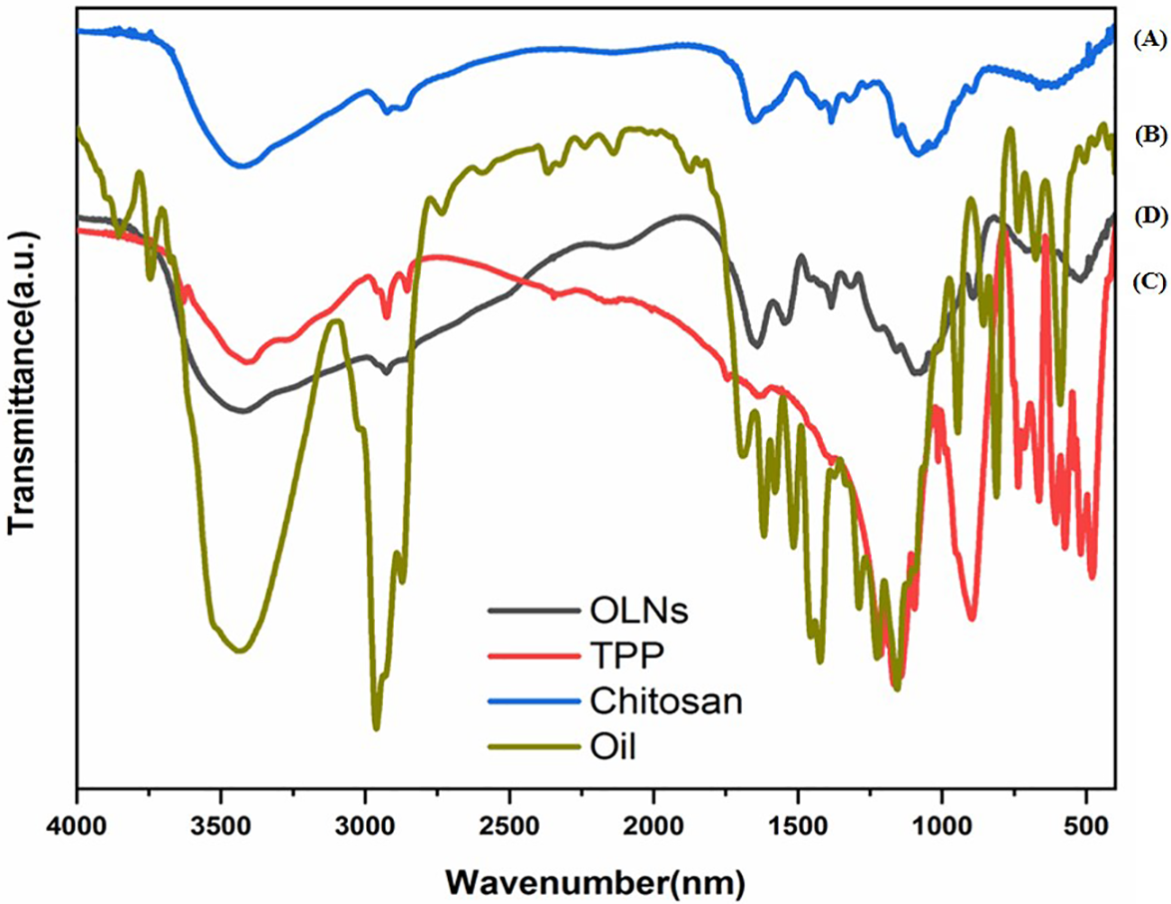 FTIR spectra of (A) chitosan particles, (B)Carum copticum EO, (C) TPP, and (D) OLNs (oil-loaded chitosan nanoparticles with chitosan to EO weight ratio of 1:0.5).