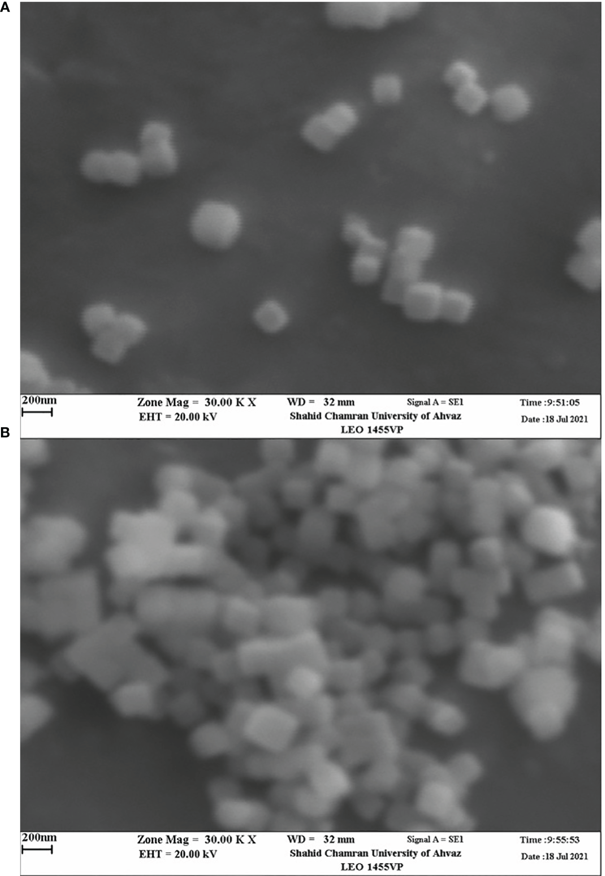 SEM micrographs of Carum copticum oil–loaded nanoparticles using an initial weight ratio of chitosan to oil of (A) 1:0.5, and (B) 1:1.