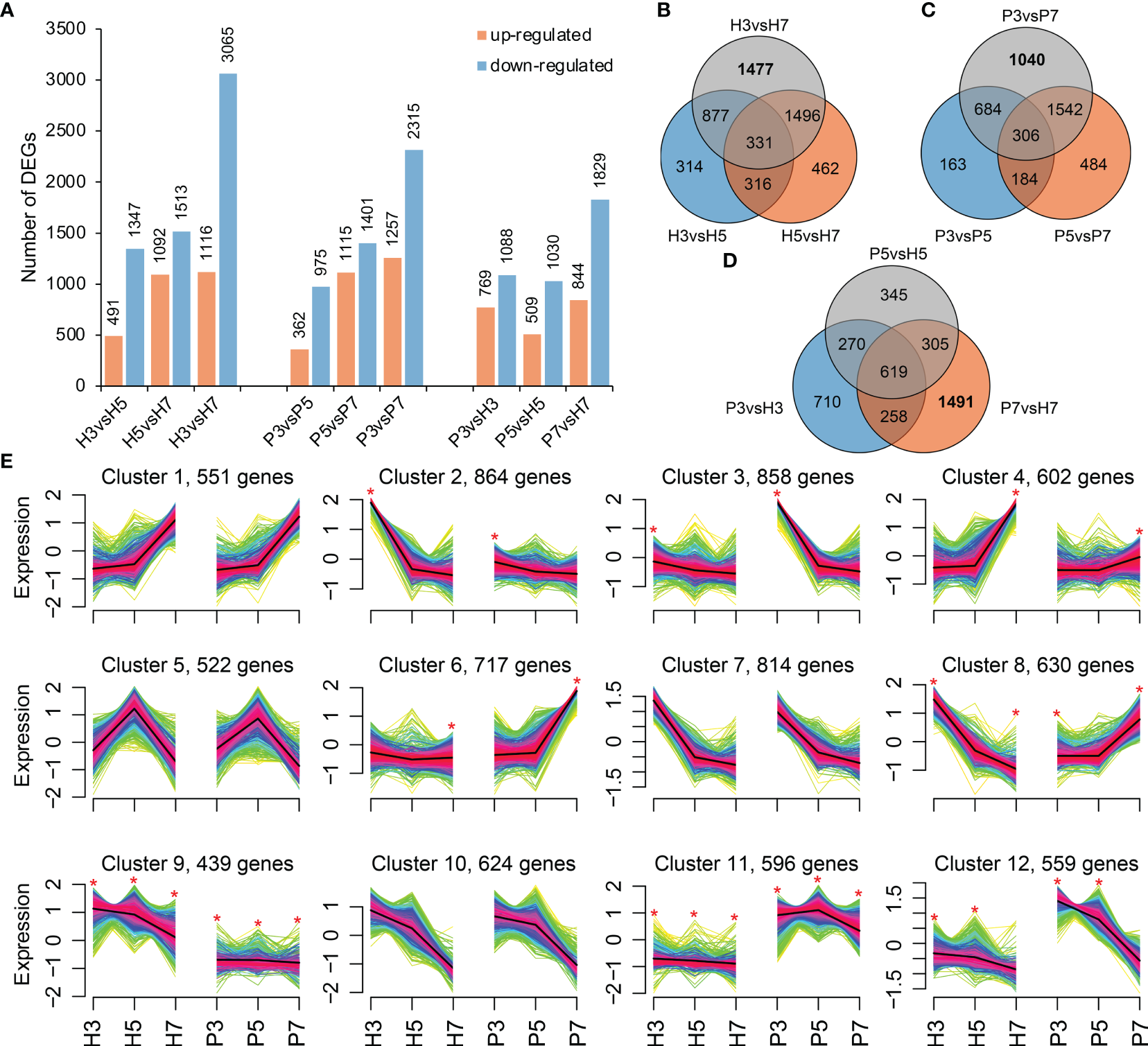 The differentially expressed genes (DEGs) analysis. (A) The number of DEGs in pairwise comparison groups. (B, C) Venn diagram of DEGs at different developmental stages of Hongfei and Pengzhoubai, respectively. (D) Venn diagram of DEGs between Hongfei and Pengzhoubai at three developmental stages. (E) Fuzzy cMeans clustering of gene expression trends. Asterisk indicates that the DEGs exhibit different expression patterns between two varieties. A total of 7,776 DEGs were used for the clustering analysis.