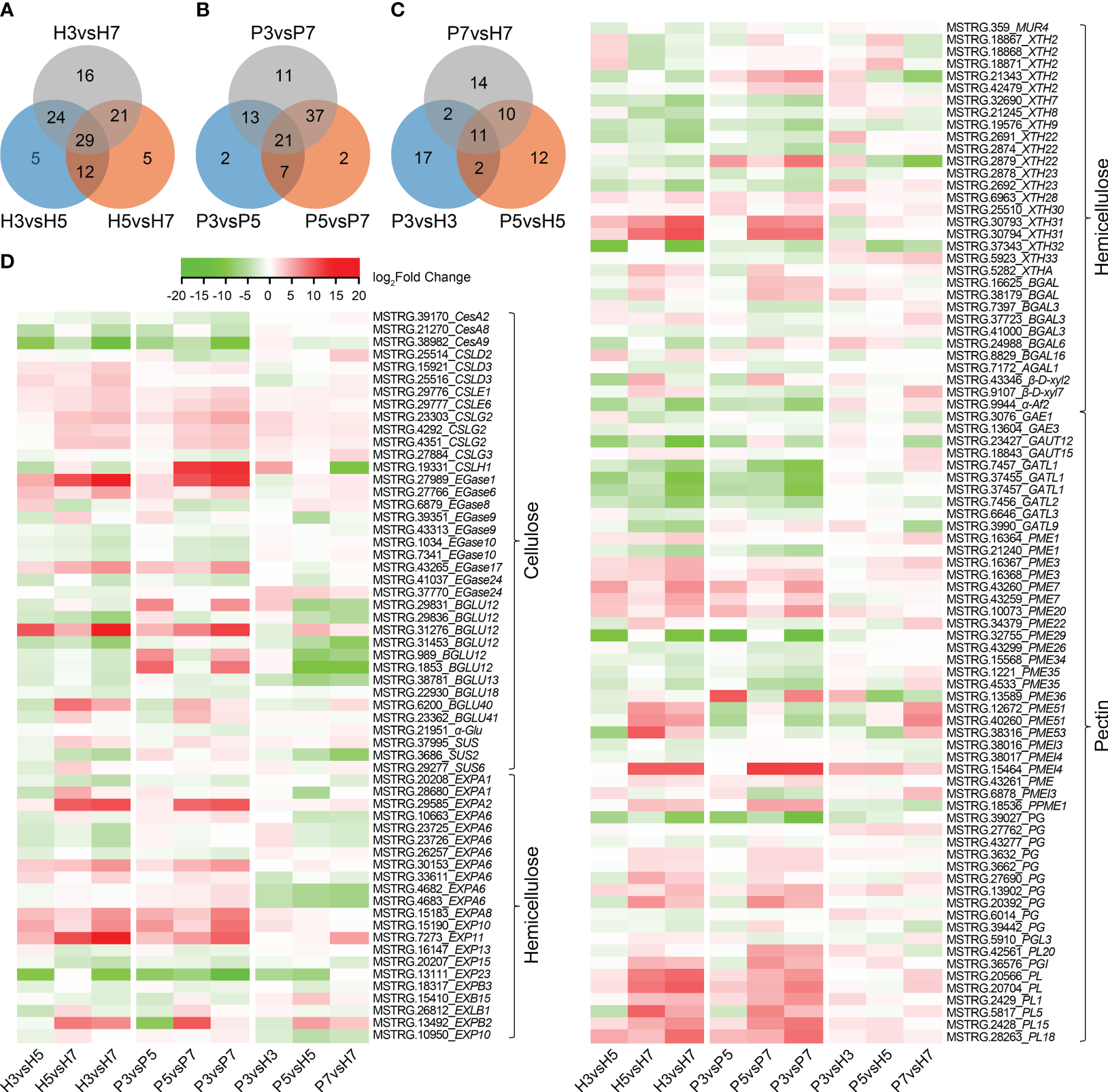Heatmap display of DEGs involved in cell wall metabolic pathways in Chinese cherry fruits. (A, B) Venn diagram of DEGs for comparisons between different developmental stages in Hongfei and Pengzhoubai varieties (comparison I). (C) Venn diagram of DEGs for comparisons between Hongfei and Pengzhoubai at three developmental stages (comparison II). (D) Heatmap of DEGs related to cellulose, hemicellulose, and pectin metabolic pathways. The color scale indicates expression levels as log2fold-change values for comparison groups. CesA/CSL, cellulose synthase A/like protein; EGase, endoglucanase; BGLU, β-glucosidase; SUS, sucrose synthase; α-Glu, α-glucosidase; EXP, expansin; MUR, UDP-arabinose 4-epimerase; XTH, xyloglucan endotransglucosylase/hydrolase; BGAL, β-galactosidase; β-D-xyl, β-D-xylosidase; AF, α-L-arabinofuranosidase 2; GAE, UDP-glucuronate 4-epimerase; GAUT, galacturonosyltransferase; PME, pectinesterase; PG, polygalacturonase; PL, pectate lyase.