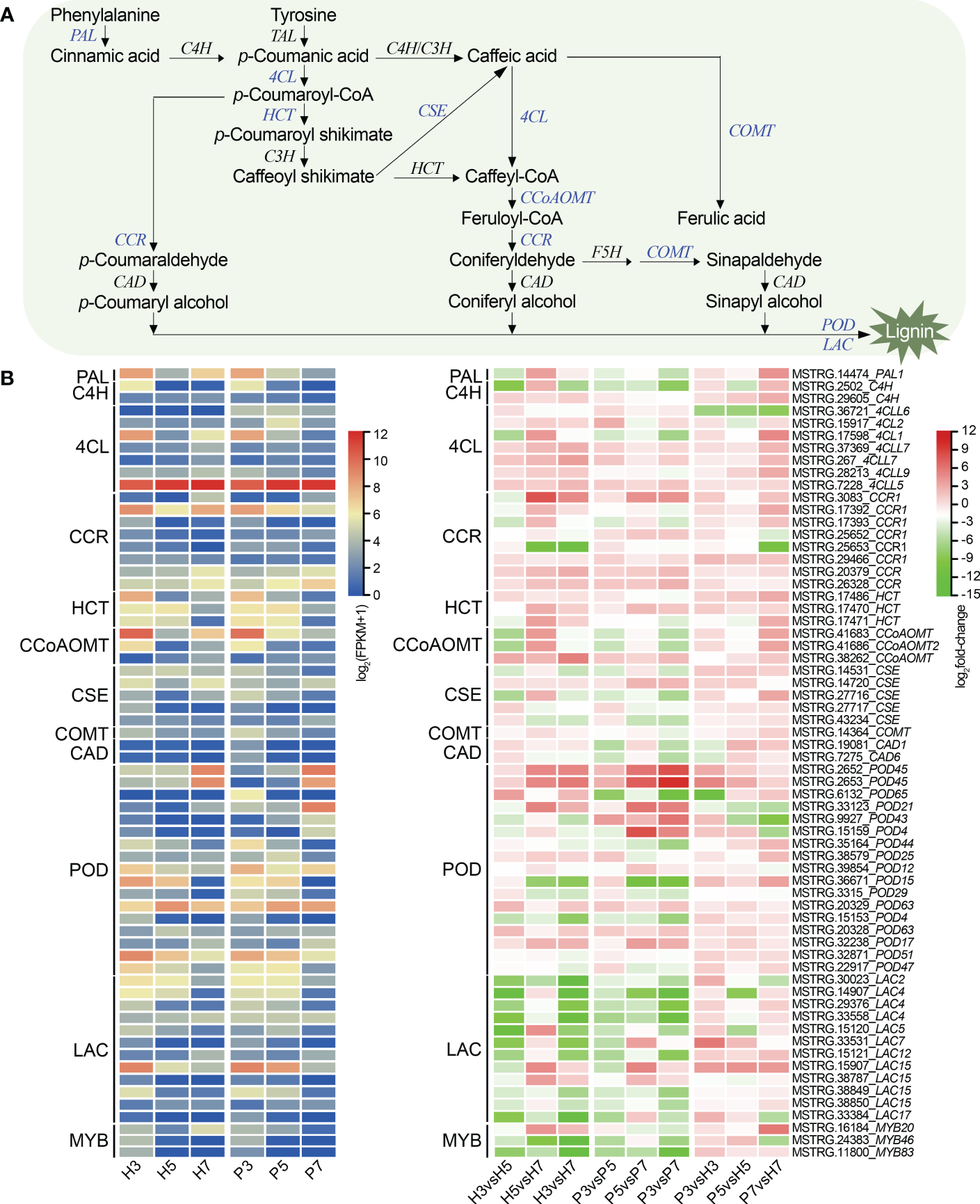 Gene expression profiles in the lignin biosynthesis pathway in Chinese cherry fruits. (A) A simplified model of the lignin biosynthesis pathway in Chinese cherry. (B) Heatmap representation of DEGs related to lignin biosynthesis. The color scales indicates expression levels as log2(FPKM + 1) and log2fold-change values, respectively. PAL, phenylalanine ammonium lyase; TAL, tyrosine ammonia-lyase; C4H, cinnamate-4-hydroxylase; 4CL, 4-coumarate-CoA ligase; CCR, cinnamoyl-CoA reductase; HCT, shikimate O-hydroxycinnamoyltransferase; C3H, p-Coumarate 3-hydroxylase; CCoAOMT, caffeoyl-CoA O-methyltransferase; F5H, ferulate 5-hydroxylase; CSE, caffeoyl shikimate esterase; COMT, caffeic acid 3-O-methyltransferase; CAD, cinnamyl alcohol dehydrogenase; POD, peroxidase; LAC, laccase.
