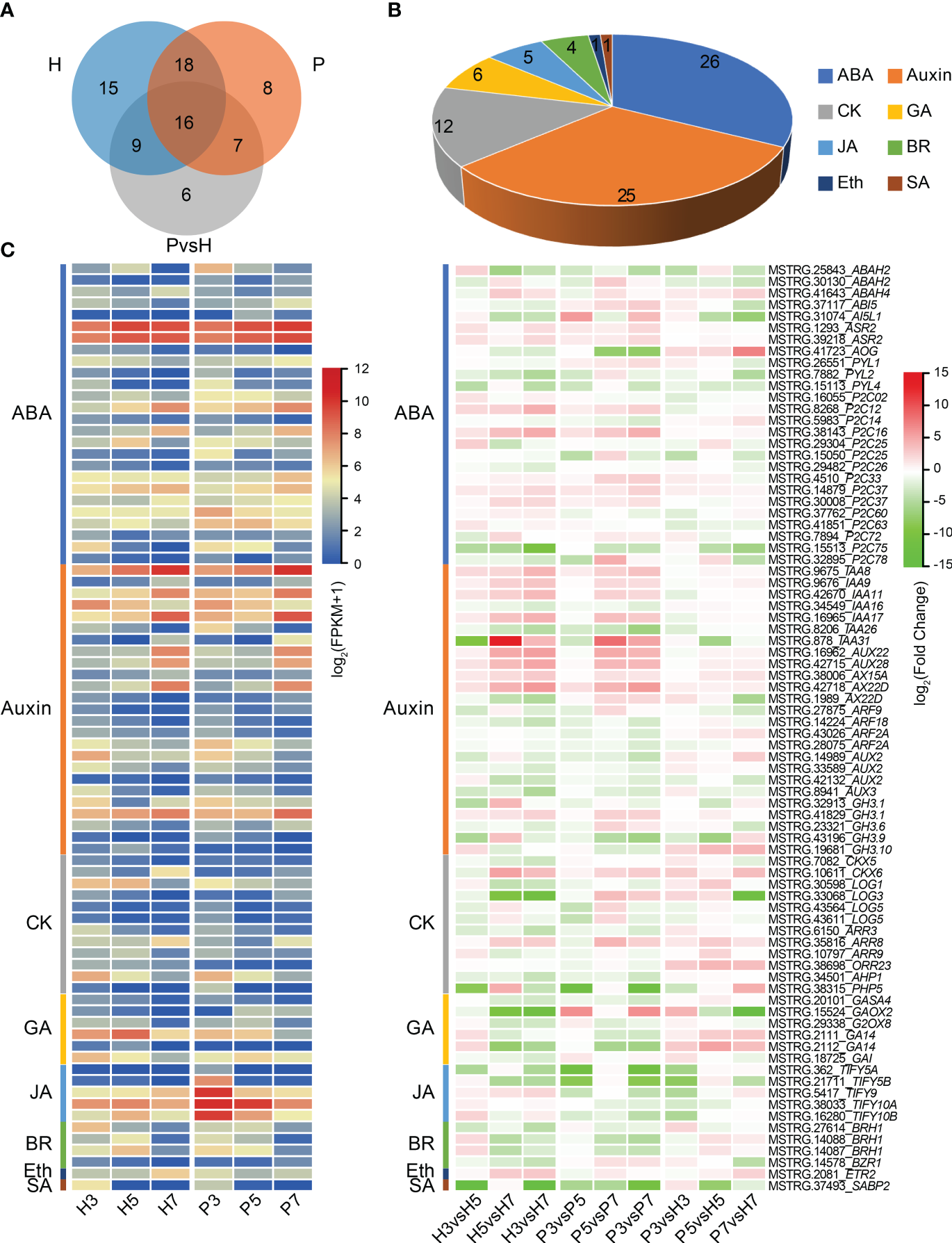 Differential expression of plant hormone signaling genes in Chinese cherry fruits. (A) Venn diagram representing the extent of overlap between genes identified in the indicated pairwise comparisons. H and P refer to DEGs in comparisons between different developmental stages in Hongfei and Pengzhoubai (comparison I). P vs. H refers to DEGs in comparisons between the two varieties in three developmental stages (comparison II). (B) Number of differentially expressed plant hormone signaling genes. (C) Heatmap representation of DEGs related to different plant hormones. The color scales indicate expression levels as log2(FPKM + 1) and log2fold-change values, respectively. ABA, abscisic acid; CK, cytokinin; GA, gibberellic acid; JA, jasmonic acid; BR, brassinosteroid; Eth, ethylene; SA, salicylic acid.