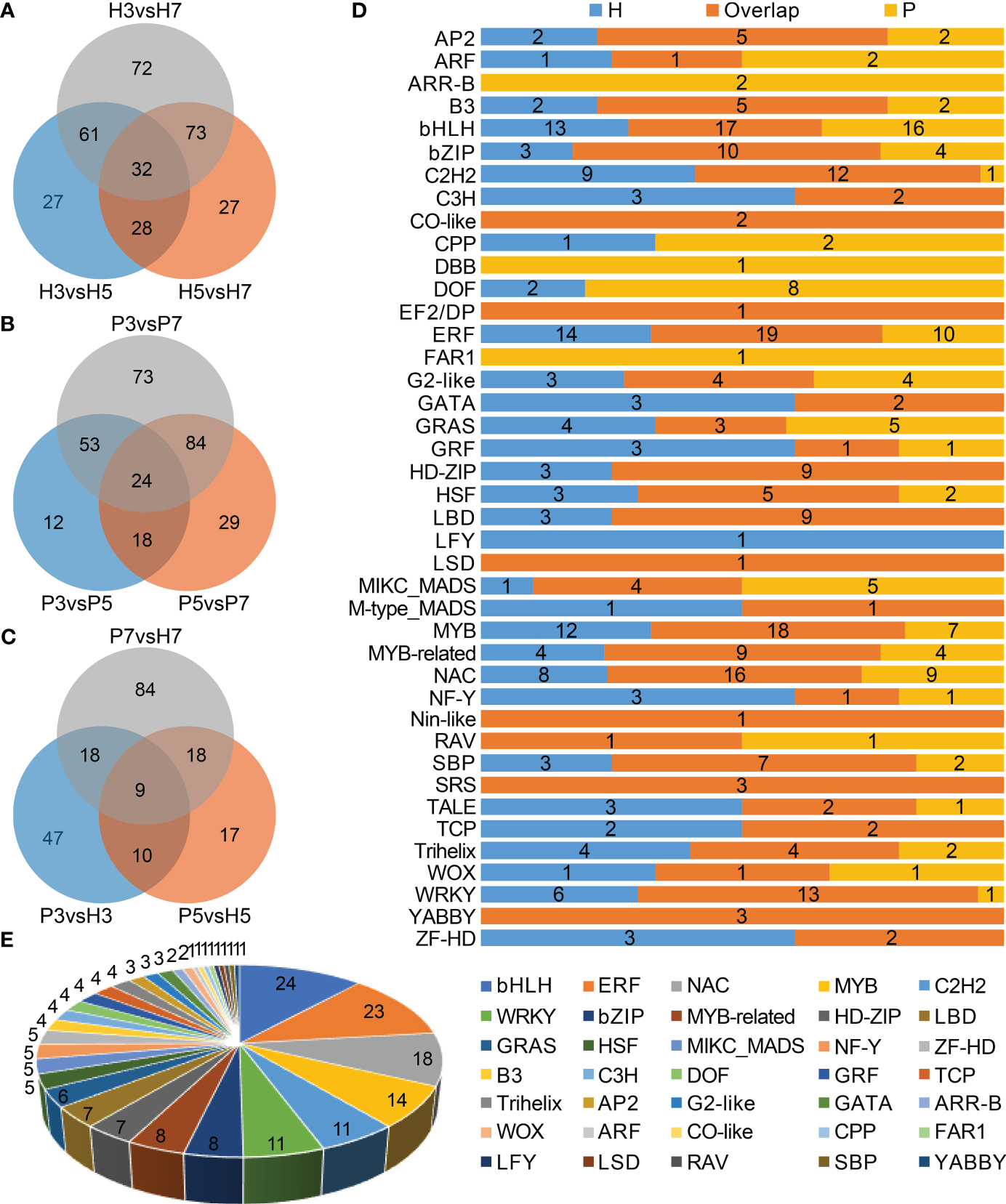 The differentially expressed genes were identified by comparisons within intra-varieties at different stages (H3 vs. H5, H5 vs. H7, H3 vs. H7 and P3 vs. P5, P5 vs. P7, P3 vs. P7; comparison I) and inter-varieties at the same stage (P3 vs. H3, P5 vs. H5, and P7 vs. H7; comparison II). In comparison I, a total of 8,624 and 7,425 DEGs were obtained in Hongfei and Pengzhoubai, respectively (Figure 2A). The number of down-regulated genes was substantially higher than that of up-regulated genes in both varieties. The most DEGs were observed in H3 vs. H7 and P3 vs. P7 comparison pairs (Figure 2A), with 1,477 and 1,040 DEGs being unique in this pair for Hongfei and Pengzhoubai (Figures 2B, C). In comparison II, 1,857, 1,539, and 2,673 DEGs were identified at S3, S5, and S7 stage, respectively (Figure 2A). 619 common DEGs were identified among three stages, and 1,491 DEGs were unique for S7 stage between two varieties (Figure 2D).