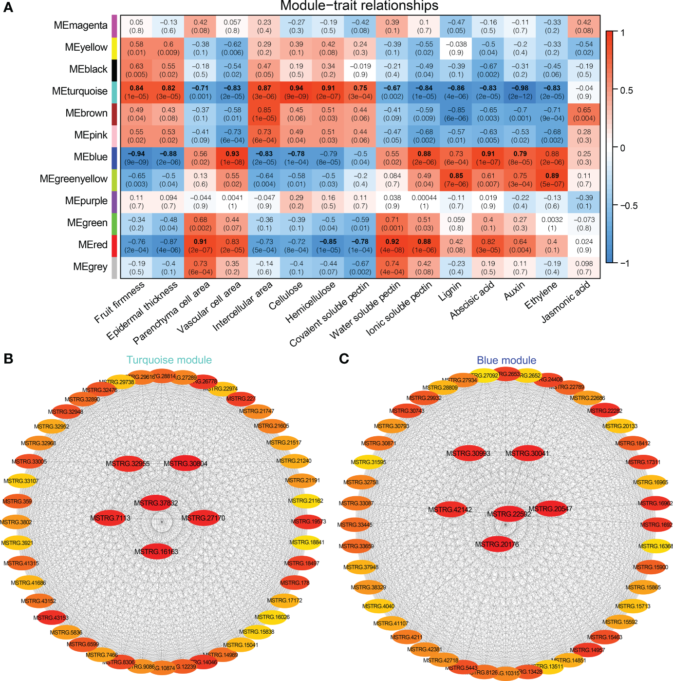 All the DEGs were filtered to remove genes that had low expression levels (FPKM < 2) in all samples. Weighted gene co-expression network analysis was performed in R using default parameters. An adjacency matrix was constructed based on the normalized FPKM values. The phenotype data during fruit softening were imported into the WGCNA R software package to calculate correlation-based connections between phenotypes and modules. Subsequently, the adjacency matrix was converted into a topological overlap matrix (TOM). The genes with identical expression patterns were assigned into one module according to the network, and eigengenes were determined for these modules. The network of the genes from Turquoise and Blue modules was exported using Cytoscape software.