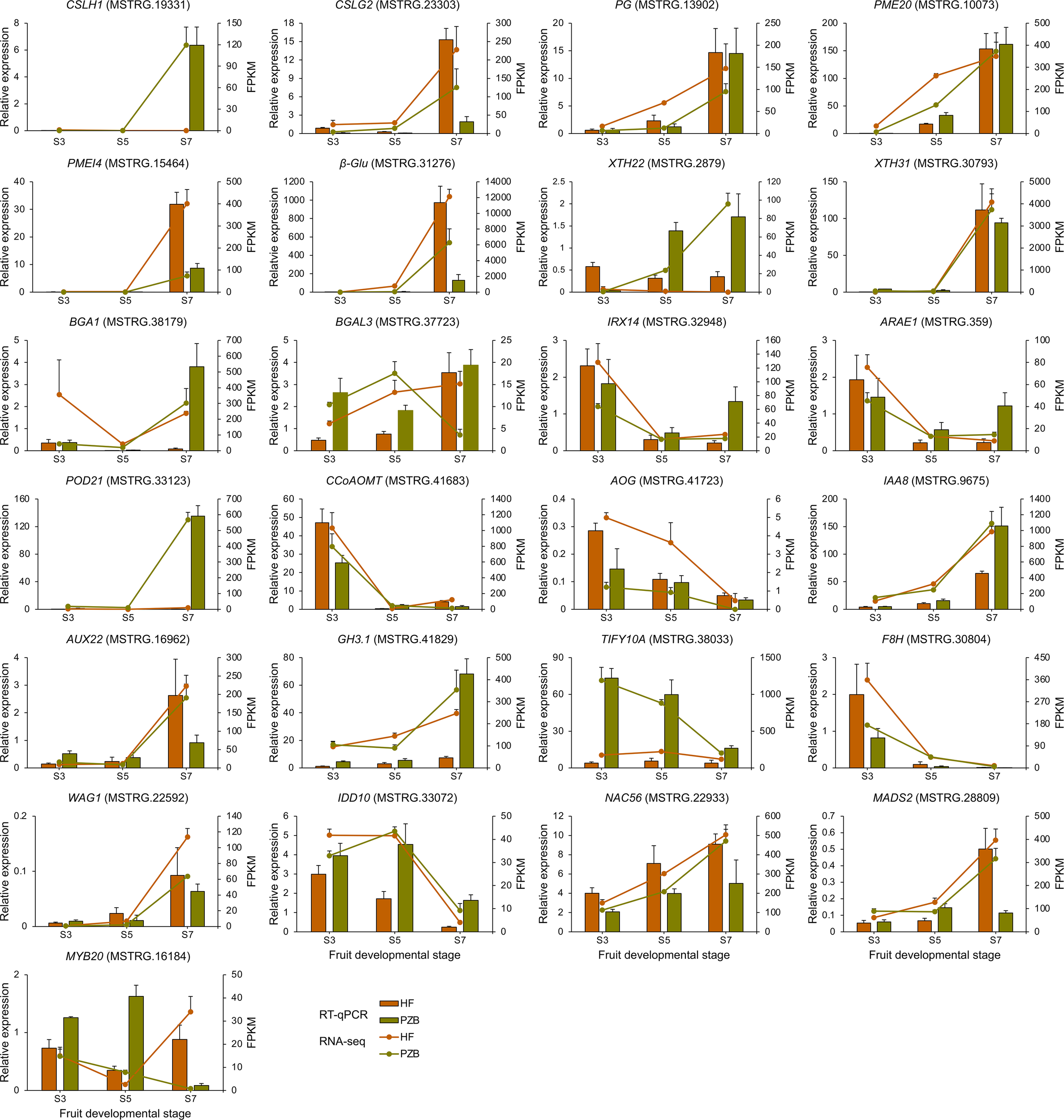 We observed the alterations in cell wall components at S3, S5, and S7 stages in both two varieties. As shown in Table 1, the contents of cellulose and hemicellulose decreased during fruit development in Chinese cherry, WSP and ISP level increased through the same stage. Obvious differences were detected between them, as hard-fleshed Hongfei fruits included more cellulose, hemicellulose, and less WSP and ISP, than the soft-fleshed Pengzhoubai at three stages. Lignin content in both fruits slightly increased with fruit ripening, and it was significant higher in Hongfei than that in Pengzhoubai through fruit development. These results suggested that fruit softening in Chinese cherry largely attributed to the degradation of cell wall components, and that differences in fruit firmness between varieties were caused by the changes of cellulose, hemicellulose and pectin contents, as well as lignin content.