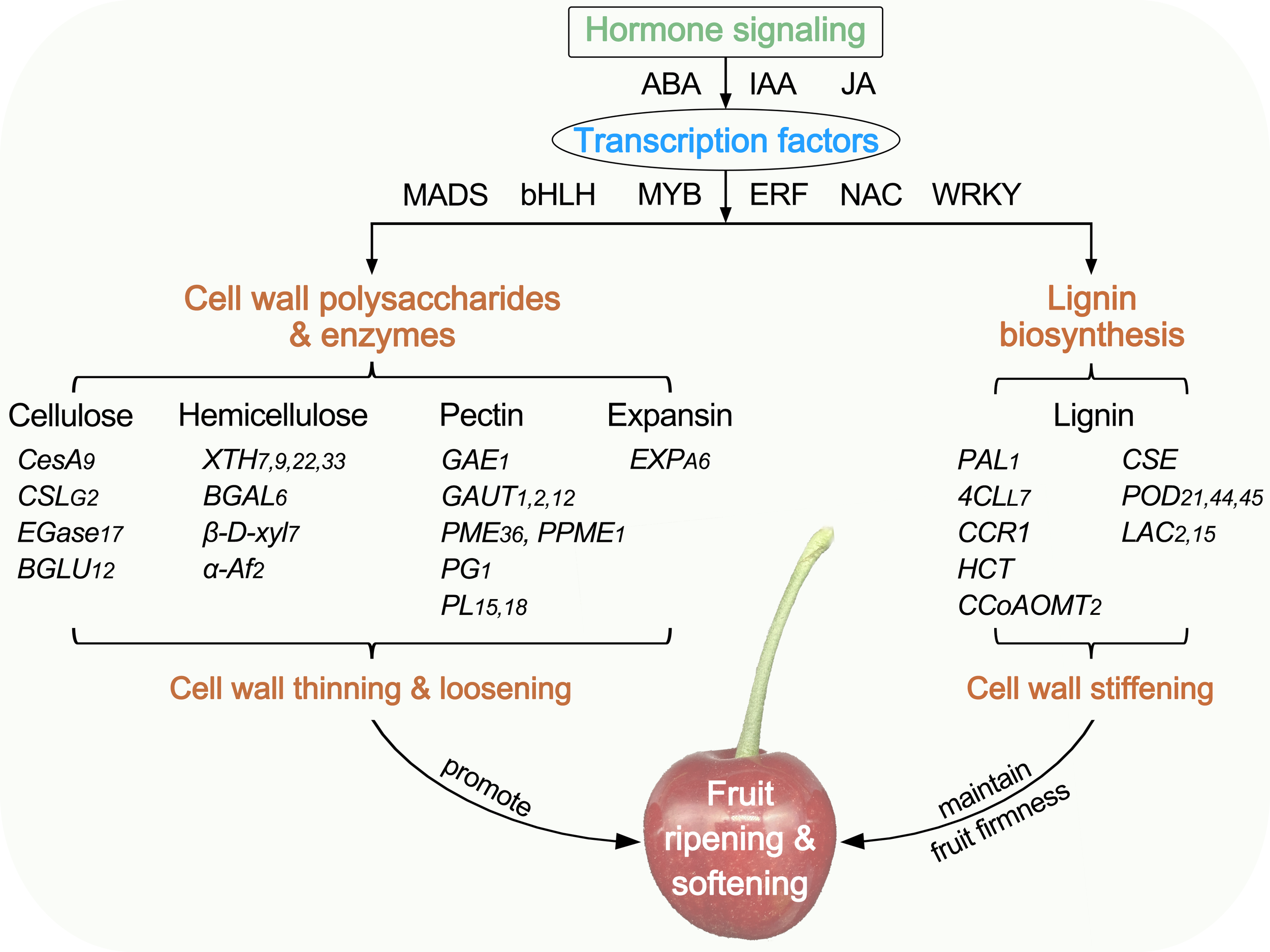 Chinese cherry [Cerasus pseudocerasus (Lindl.) G.Don], as an economically fruit crop native to China, is characterized by the characteristic of precocity, high ornamental value, delicious taste, and rich nutrition (Yü et al., 1986; Chen et al., 2016). Recently, the cultivation of Chinese cherry has been growing vigorously in China, which has increasingly contributed to rural tourism and rural revitalization especially South China (Chen et al., 2016). However, the fruits are susceptible to softening and rotting after harvest, strongly limiting the circulation to the consumer market, which has greatly hindered the development of Chinese cherry industry (Wang et al., 2022c). Therefore, uncovering the mechanisms behind softening is a requirement before attempting to resolve this constraint in Chinese cherry.