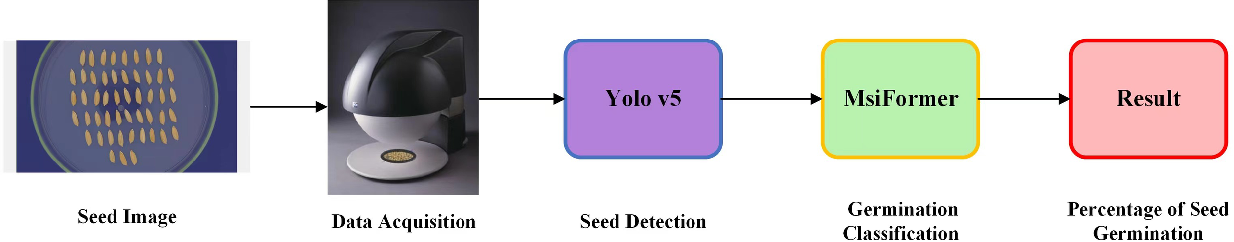 In order to efficiently perform end-to-end non-destructive seed germination detection, a pipeline as shown in Figure 1 was proposed. Firstly, the seed images were collected through Videometer Lab4™ for data acquisition, which can obtained a large number of multispectral images. Secondly, the object detection of image data was performed by Yolo v5, and the ROI segmentation of individual seed was implemented. Then, the extracted multispectral image of each seed was input into the designed MsiFormer for predicting germination. Finally, the final germination prediction results of individual seeds were obtained by MsiFormer.