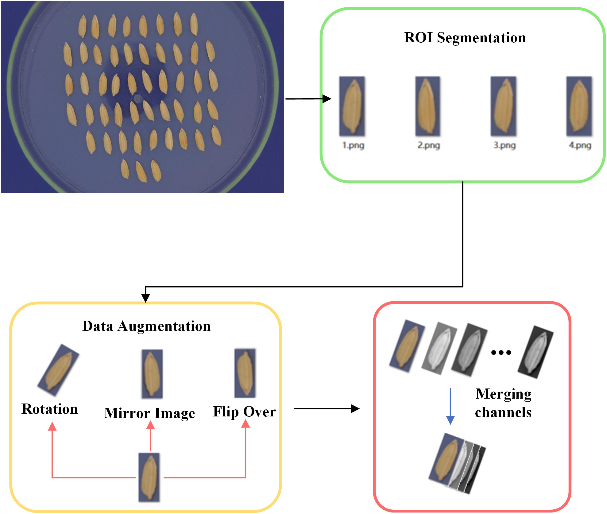 Data augmentation was applied for dataset construction (Figure 2). After ROI segmentation, images of individual seed were rotated, mirrored and flipped, for the purpose of enriching the training data and improving the learning ability of the algorithm for complex data. Finally, images were resized to 256*256, and channels of RGB image and 19 spectral images were merged to generate 22 channels of multi-channel data.