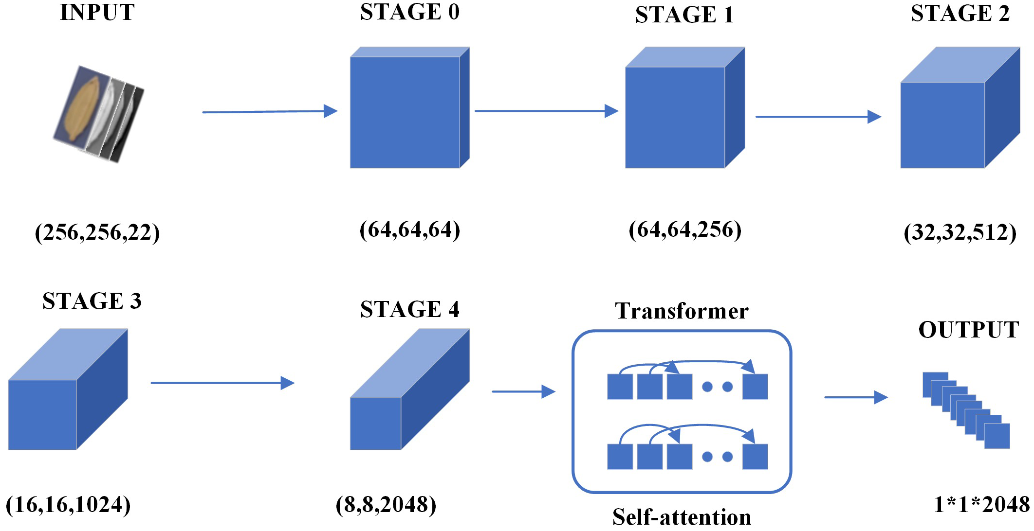 Figure 3 briefly showed the architecture of the neural network used for germination prediction purposes. The input to the deep learning model was an image with height of 256, width of 256, and channels of 22, while the output was a feature map with height of 1, width of 1, and channels of 2048 (Figure 3). Our deep learning backbone network adopted the idea of combining residual structure and Transformer. The residual structure was initially used to design five large residual convolution layers to perform residual convolution operation on the feature map and learn the feature information of the seed. The skip connection of residual structure was used in each convolutional layer, which greatly reduced the loss of details of features and solved the problem of gradient disappearance and gradient explosion of convolutional networks.