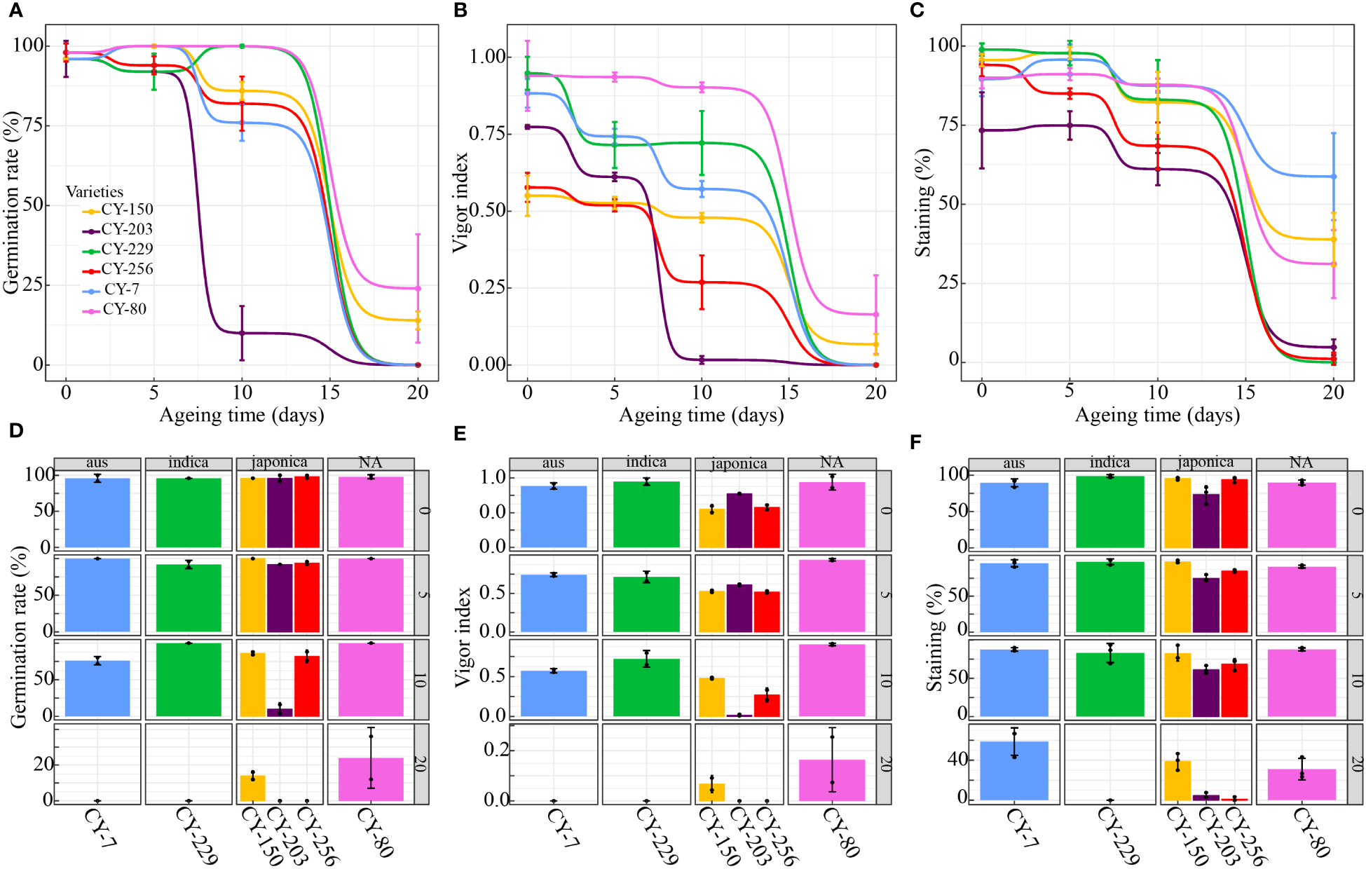 Germination rate (A, D), vigor index (B, E) and TTC staining (C, F) of 6 rice varieties after treatments of 0-, 5- 10- and 20-day accelerated ageing).