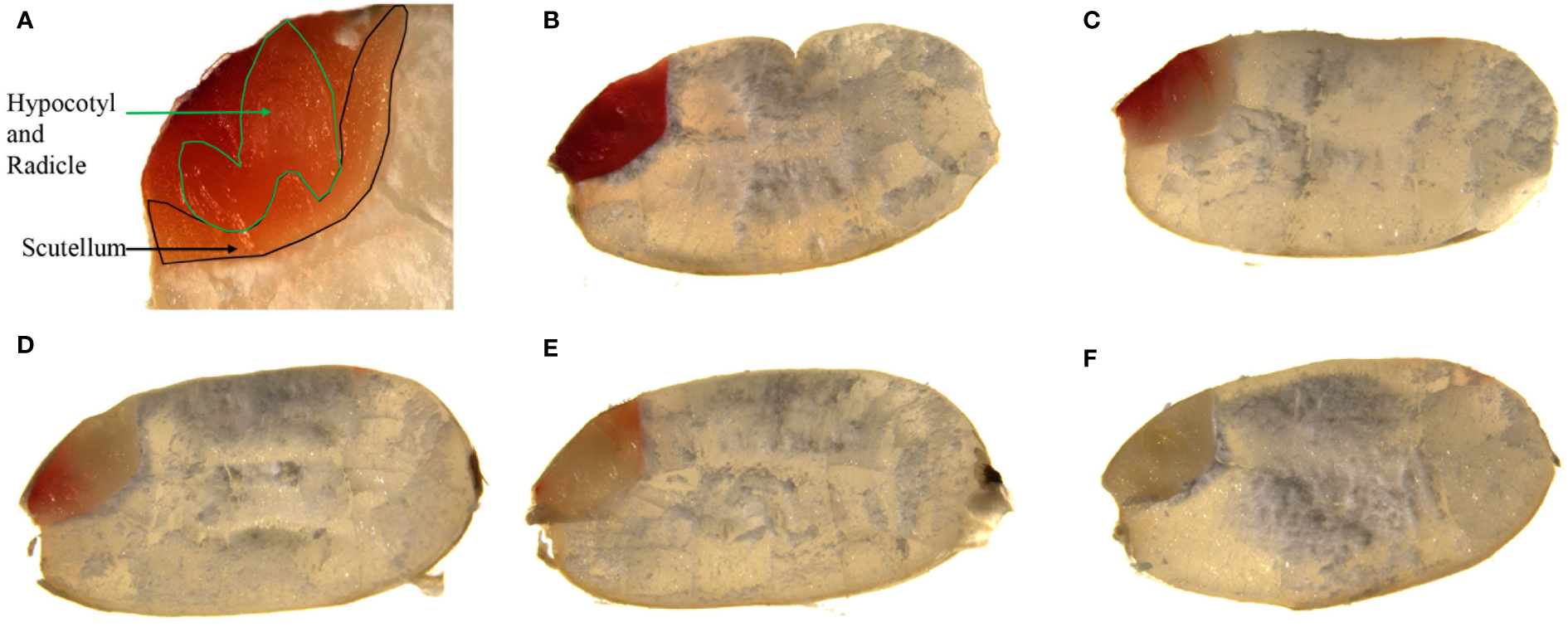 TTC staining of rice variety CY-150 after accelerated ageing. (A): structure diagram of embryo of rice seed after TTC staining; (B–F): indication of intensity and distribution of TTC staining of the whole embryo.