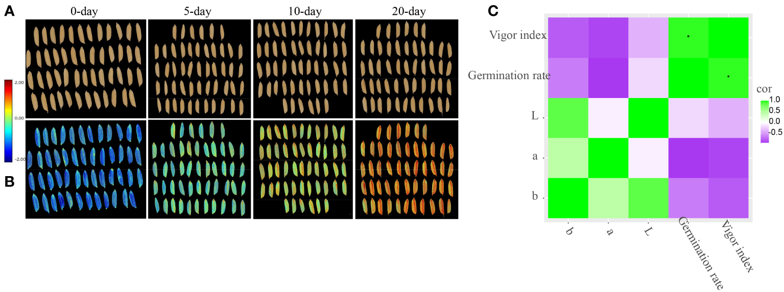 Besides global assessment, CIELab values of nCDA were all negatively correlated with vigor index and germination rate, where CIELab A* had Pearson’s correlation coefficient of -0.8866 and -0.9340 with vigor index and germination rate, respectively (Figure 7C), also revealing the potential of CIELab analysis of nCDA image in the testing of seed vigour.