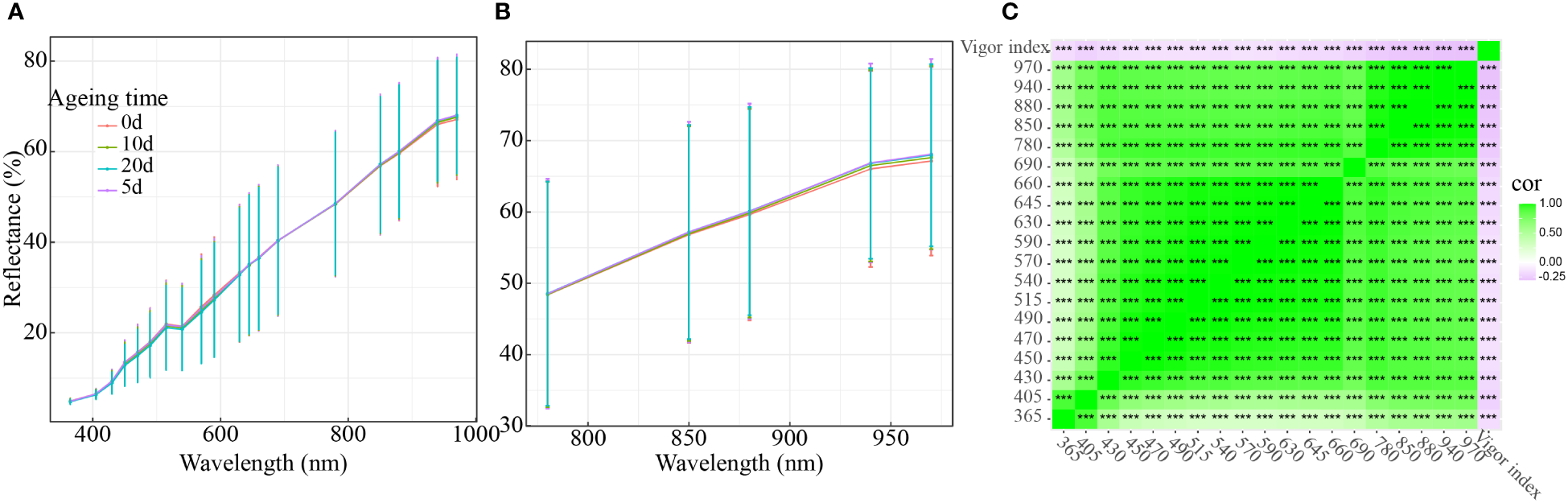 Mean reflectance spectra (from 365 nm to 970 nm) of the 6 rice varieties after 0-, 5-, 10- and 20-day accelerated ageing (A), mean reflectance spectra (from 780 nm to 970 nm) (B) and correlation between vigor index of individual seed and spectra (C) ***: significant correlation with p<0.001..