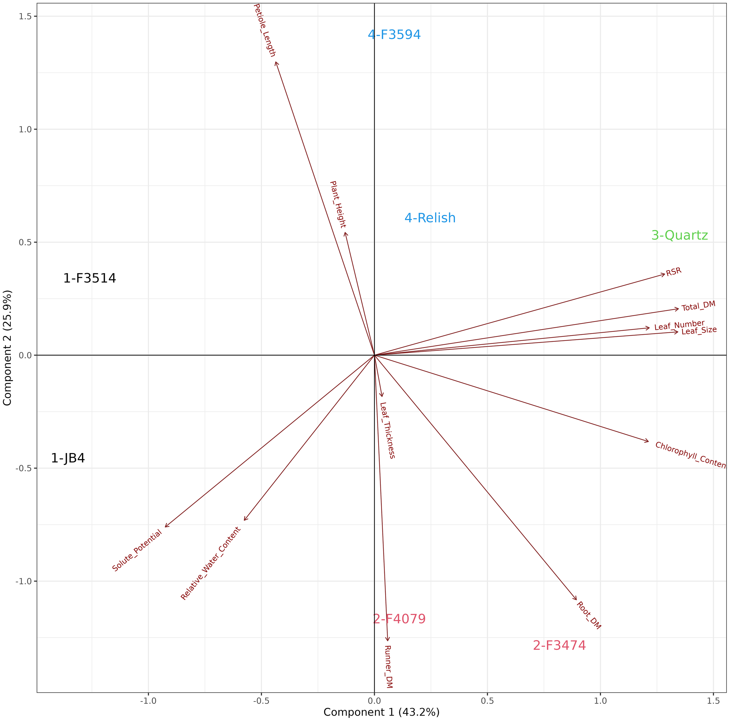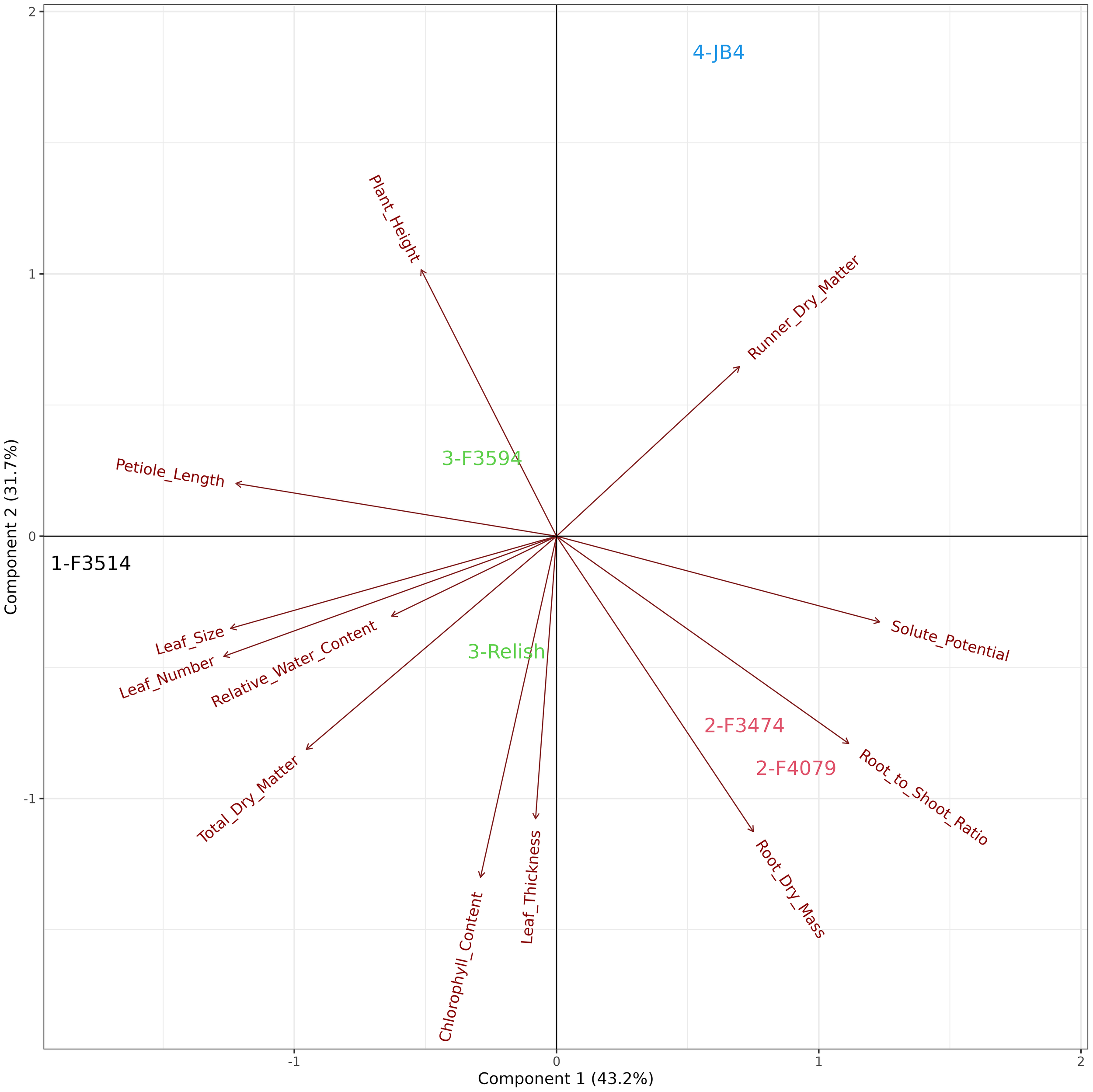 Prior to pattern analysis the data were standardized to remove scaling effects. The optimum number of entry groups from cluster analysis was determined according to Cooper and DeLacy (1994). The resulting biplot is a graphical summary of population by trait associations. Trait associations are presented through directional vectors, a positive relationship between traits is shown if vectors are separated by less than 90°. The results of the clustering analysis are superimposed on the biplot through assigning each group of populations a different color. Quartz was not included in the cluster analysis for water deficit and waterlogging to not affect the differences among the red clover populations. F2507 was not included in the cluster analysis for waterlogging as it did not survive the waterlogging treatment. Means and standard errors produced from ANOVA were used to generate column graphs.