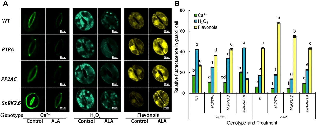 Ca2+ and H2O2 are involved in stomatal regulation (Lefoulon et al., 2016; Hauser et al., 2017; Mathe et al., 2019), which has been found in ALA-ABA regulated stomatal movement in apple (Chen et al., 2014a) and Arabidopsis (An et al., 2016b). Furthermore, ALA-promoted stomatal opening depends on flavonol accumulation in guard cells, especially in cell nuclei (Liu et al., 2016). In present work, we found that OE-MdPTPA or OE-MdPP2AC significantly increased the flavonol content while depressed Ca2+ and H2O2 in the guard cells in the transgenic tobaccos. Yet, the situations in the OE-MdSnRK2.6 were opposite. Exogenous ALA up-regulated the positive factors for stomatal opening but down-regulated the negative factors in all genotype plants (Figure 3). Thus, we provide genetic evidence that Ca2+, H2O2 and flavonol levels act at the down-stream of PTPA, PP2AC and SnRK2.6 signaling route during ALA-induced stomatal opening.