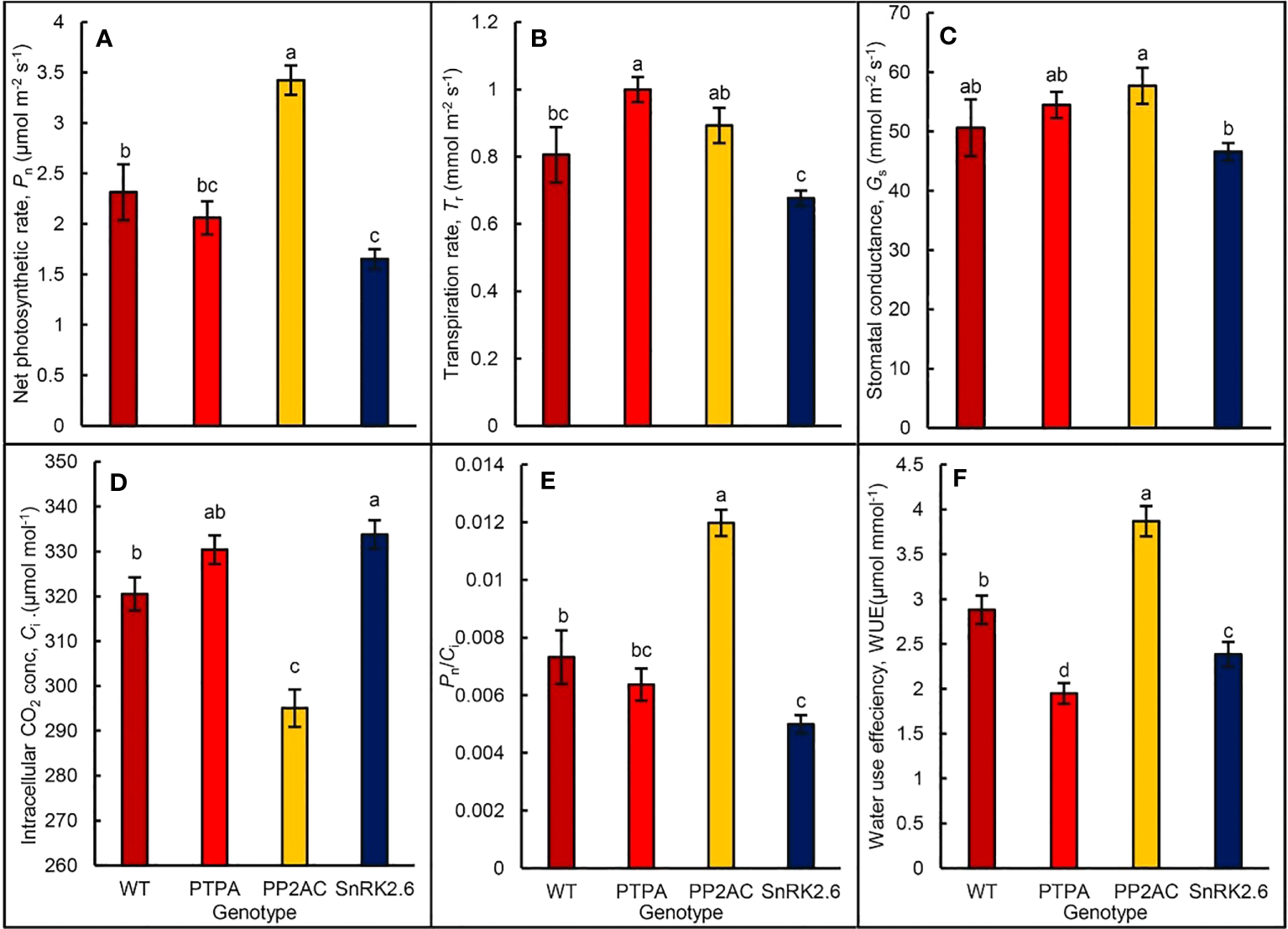 The gas exchange parameters of different genotypic tobaccos, where MdPTPA, MdPP2AC and MdSnRK2.6 were the over-expressing transgenic plants. A portable photosynthesis system (LI-6800, Li-Cor) was used to measure the parameters in the leaves of 45-day old plants. (A) the net photosynthetic rate (Pn); (B) transpiration rate (Tr), (C) stomatal conductance (Gs); (D) intercellular CO2 concentration (Ci); (E) instantaneous carboxylation efficiency (Pn/Ci); (F) water use efficiency (WUE). The values are the means ± SE of 10 replicate measurements. The same letters above the bars in each item indicate no significant difference at P = 0.05 level.